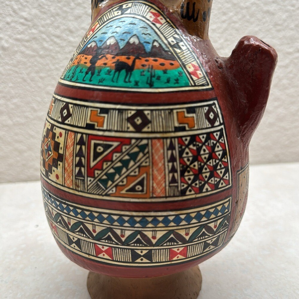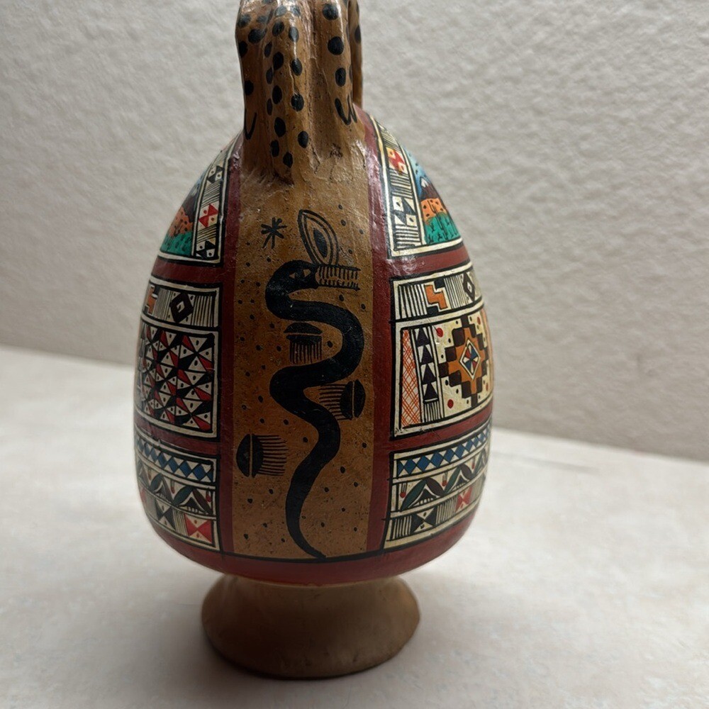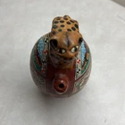 Cusco Peru Inca Jaguar Vessel Pitcher Jug Clay Folk Art Pottery Vintage. Made in Peru, Hand painted Brown/Red Clay. This one is not signed. In good condition with normal wear Measures 8" tall Does make a jingle noise - something small lodged inside - could be something that they do not sure