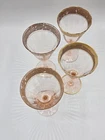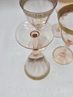 Beautiful set of four vintage wine or aperitif glasses featuring soft blush pink glass with ornate gold gilt rim decoration. These mid-century glasses showcase classic Italian styling with paneled bowls, elegant stems, and hand-applied gold detailing. Perfect for display, entertaining, or adding a touch of Hollywood Regency or Italian glamour to your barware collection. Details: • Set of 4 glasses • Height: approx. 5 3/4” • Color: blush pink • Gold gilt rim and foot accent • Vintage Italian style, mid-century era • No maker’s mark present Condition: Very good vintage condition overall. Some light age-related wear to the gold gilt, including minor thinning and small losses consistent with age and use. No chips or cracks noted. Please review photos closely.