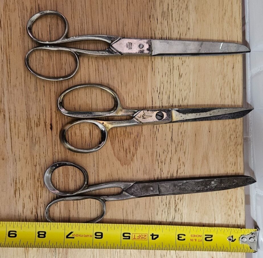 This set of vintage scissors, featuring Italian and German craftsmanship, offers a timeless tool collection for sewing and crafting enthusiasts. • Three pairs of scissors • Hand-forged steel • Vintage craftsmanship • Made in Italy and Germany • Ideal for sewing or crafting Scissors show signs of age with some rust. Length = 9 inches for each pair.