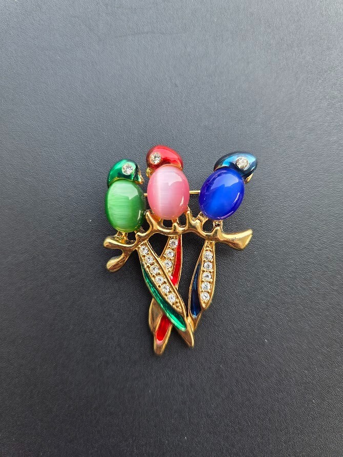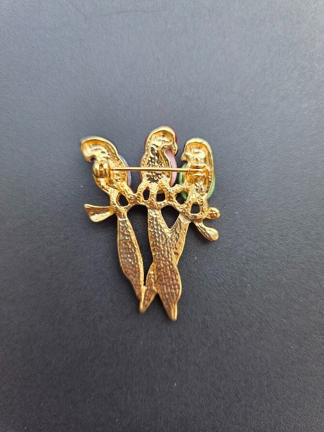 The Jelly Belly Vintage 3 Parrots Pin/Brooch in Gold Tone is a unique and colorful accessory that features three parrots in green, pink, and blue. This vintage piece of jewelry is from the fashion department and is sure to add a fun and whimsical touch to any outfit. The Jelly Belly brand ensures quality and craftsmanship, making this pin a standout addition to any collection of vintage and antique jewelry.