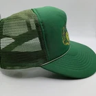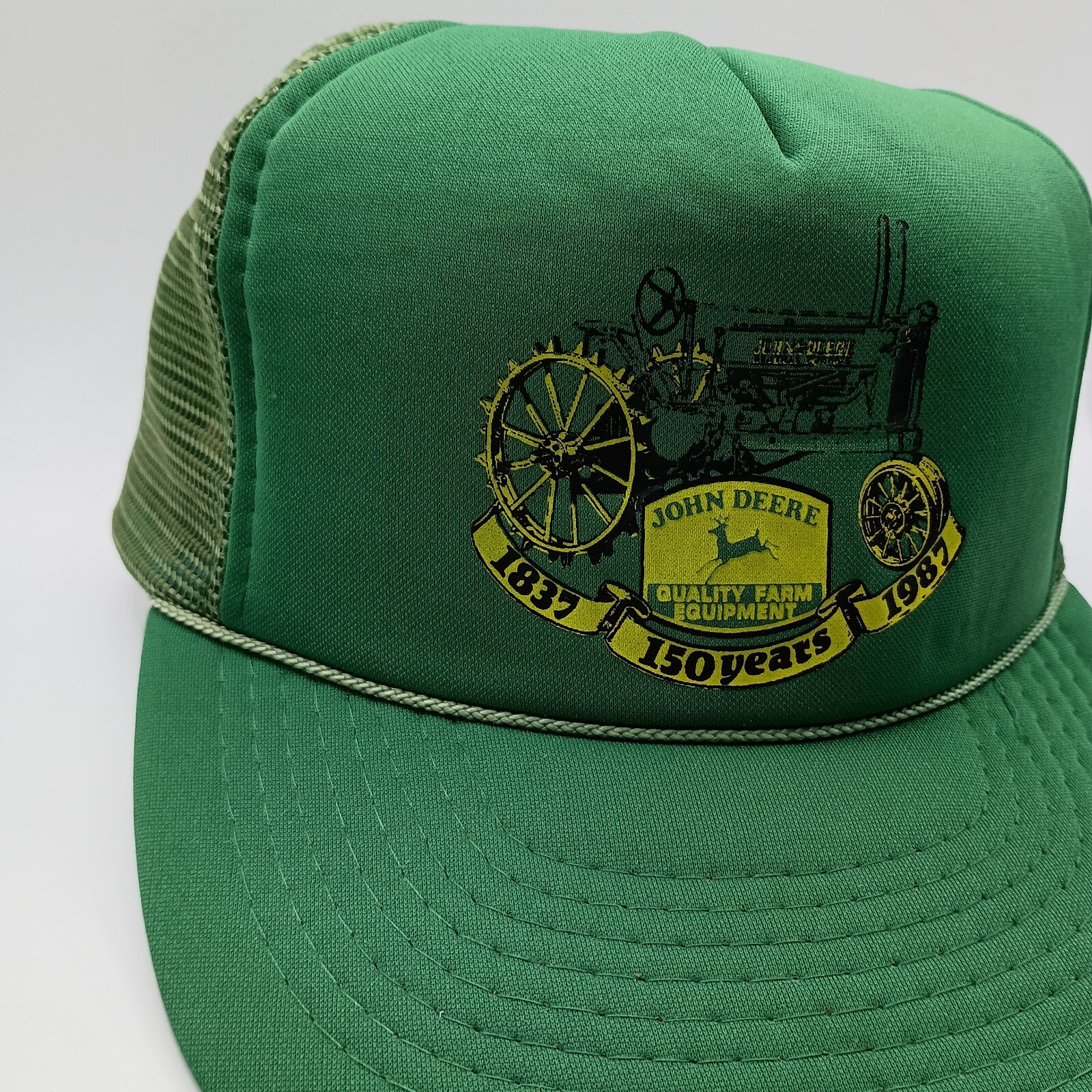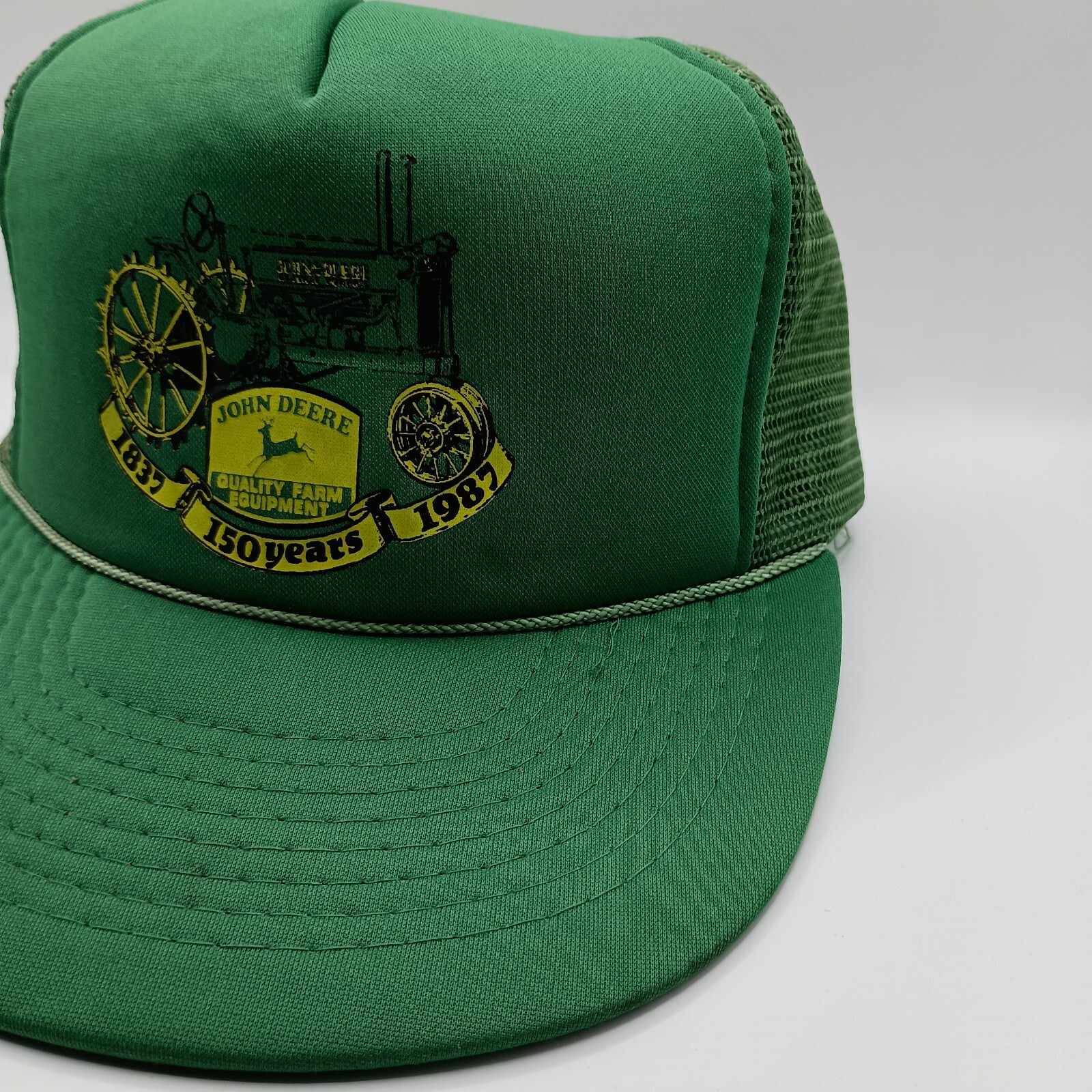 Celebrate 150 years of John Deere with this vintage snapback mesh hat. The green and yellow colors showcase the iconic brand, while the breathable mesh back keeps you cool during any season. The hat is adjustable and one size fits all, making it a perfect accessory for any farming enthusiast. The hat features a solid pattern and the John Deere character, making it a great addition to any casual or workwear outfit. Whether you're traveling or just out and about, this trucker hat will add a touch of vintage style to your look. Don't miss out on this piece of USA-themed fashion from the 80s era. Hat is in excellent condition showing little to possibly no use or wear.