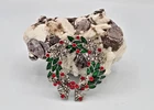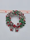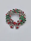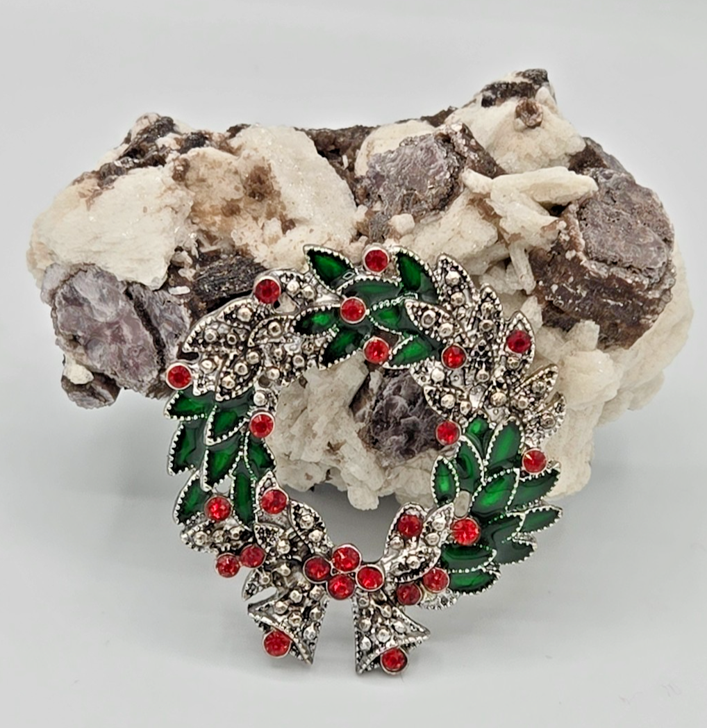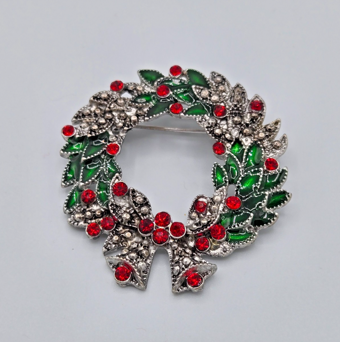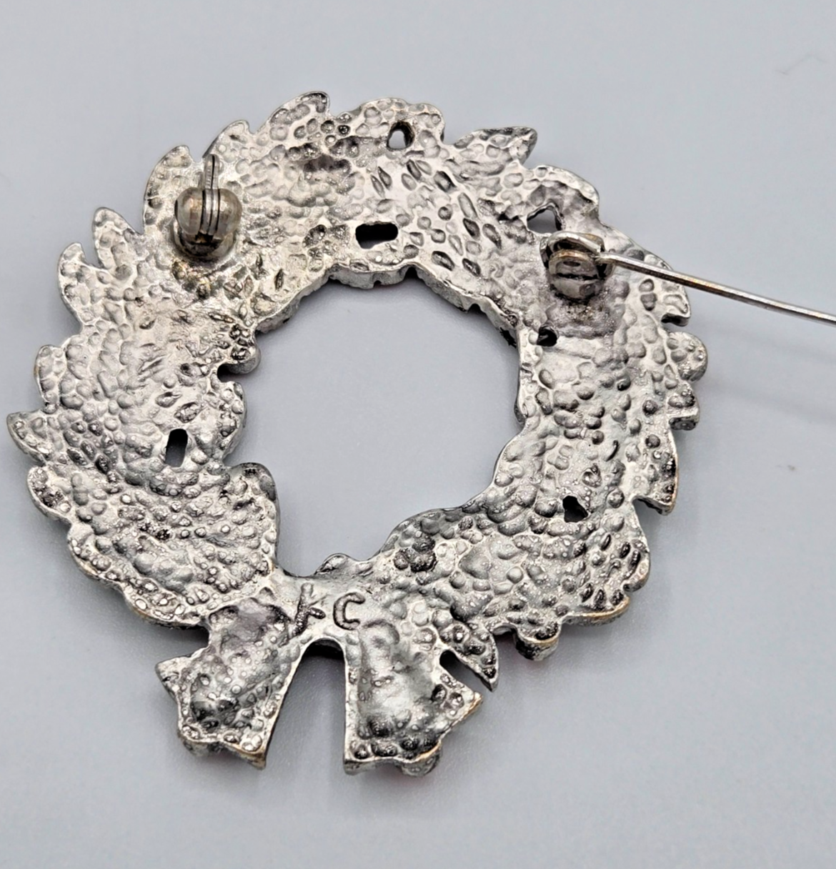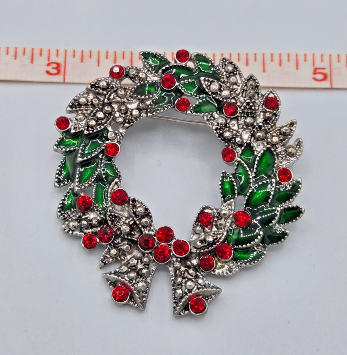 Vintage Kenneth Cole KC Christmas Wreath Brooch Green Enamel Red Rhinestone Pin Description: This beautiful vintage Kenneth Cole (KC) Christmas wreath brooch is a standout holiday accessory featuring vibrant red rhinestones , detailed green enamel holly leaves , and an antiqued silver-tone textured finish . The sparkling stones and dimensional cast metal give this brooch a high-quality designer look perfect for collectors and holiday jewelry lovers. The brooch measures approximately 2.25 inches (see photo with ruler). Pin mechanism is strong and secure. All stones are present and bright, and the enamel is in excellent condition. Ideal for wearing on coats, scarves, hats, blazers, or adding to a vintage holiday brooch collection. Item Details: Brand: Kenneth Cole (KC hallmark on back) Design: Christmas wreath with bow Stones: Red & clear rhinestones Material: Silver-tone textured metal Details: Translucent green enamel leaves Size: Approx. 2.25" Era: 1990s–early 2000s vintage Condition: Excellent vintage condition; no missing stones, secure pin back This is a festive, collectible brooch that adds instant holiday charm. Perfect for gift-giving or seasonal wear. Shipping: Carefully packaged and shipped with tracking. Keywords: Kenneth Cole brooch, KC wreath pin, vintage Christmas jewelry, holiday rhinestone brooch, enamel holly pin, festive wreath jewelry, collectible holiday brooch, red rhinestone Christmas pin, vintage designer brooch