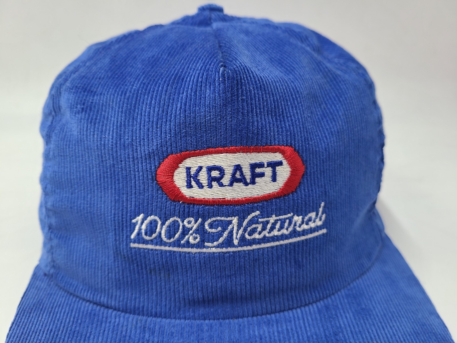 Has some stains/discoloration on the front as seen in photos. Vintage Kraft Foods 100% Natural Corduroy Snapback Hat Cap Men Made in USA Blue. EACH ADDITIONAL HAT PURCHASED IS ONLY $1 ADDED SHIPPING!