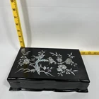 This jewelry box is absolutely stunning! The intricate mother of pearl inlay and lacquered bird design give it such a unique, elegant Asian charm. Even with minor wear, the craftsmanship shines—it’s a beautiful vintage piece that adds cultural flair to any dresser. Love the handmade details!