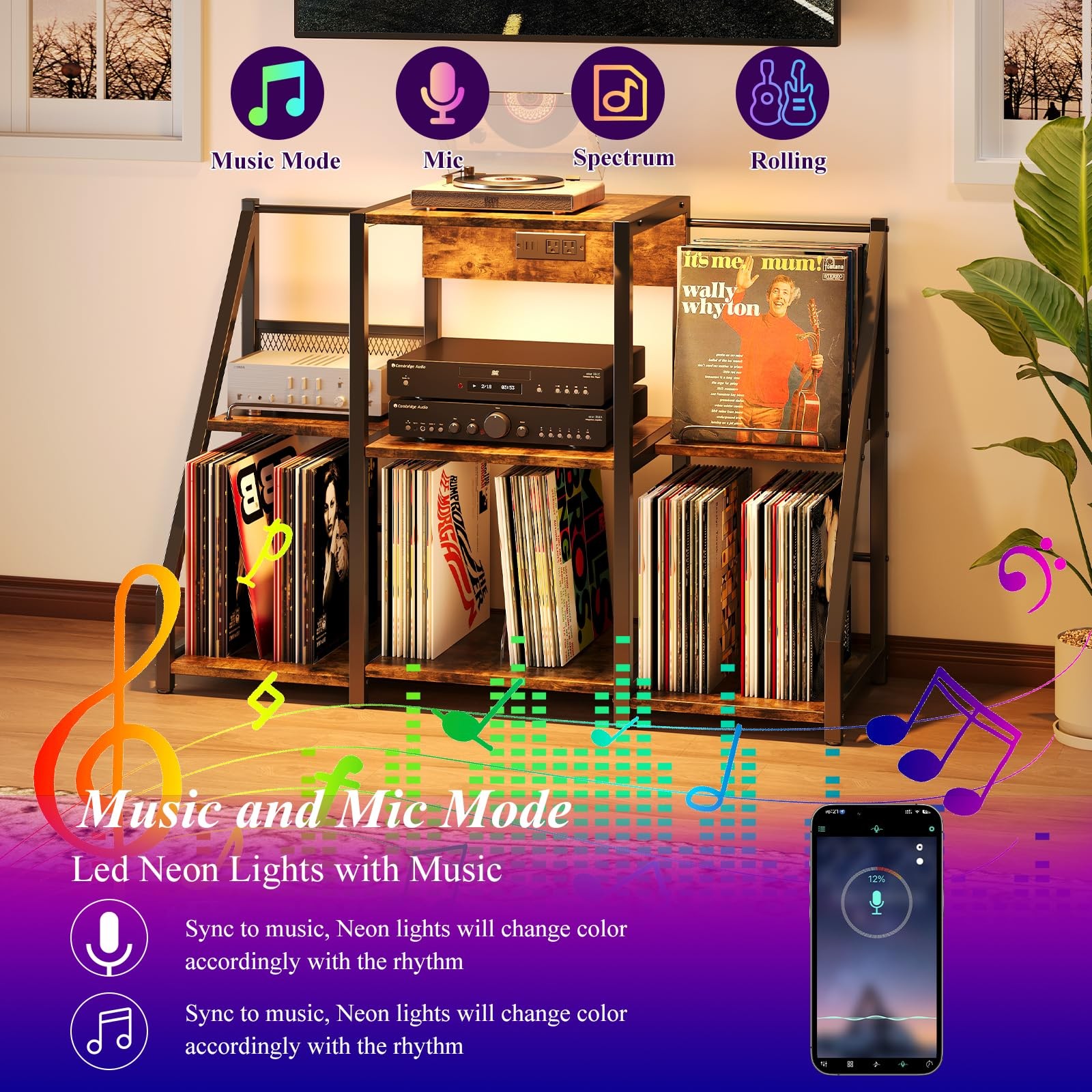 【Easy Assembly & Customer Service】 The whole item is very easy to put together and takes less than a half hour. We strive to make your experience as convenient as possible, each component is clearly numbered, and you can effortlessly follow the illustrated steps to assemble it.if you have any problems, please be free to contact us, we will response to you in 24 hours. 【Large Capacity Vinyl Record Storage】Featuring a spacious three-tiered shelf design and two dedicated vinyl display holders, our record cabinet offers storage for up to 300 albums. You'll find practical top and middle surfaces perfect for audio equipment placement or displaying decorative items, books, and media accessories. Combines functional storage with sleek presentation for collectors and vinyl lovers alike. 【Record Player Stand with Power Outlet and USB Port】The vinyl record storage device is equipped with 2 standard sockets and 2 USB ports. eliminating bulky power strips while powering your turntable and devices. A short LED strip comes attached to the bottom of the top shelf and can be controlled with a supplied remote controller which provides several lighting options. Unique lighting enhances your space with stylish ambiance, blending functional design with romantic aesthetics. 【With Adjustable Record Holder】The footpads of the unit can be individually adjusted which is important for turntable users since the turntable should be level. Come with 3 dividers, and pre-drilled 8 holes, You have the freedom to customize the width of the slots according to your preferences. Arrange your vinyl records by music genre, artist, or era, creating a personalized organization system that suits your needs. 【Sturdy and Beautiful】The vinyl record storage stand is designed with MDF board and coated metal iron tubing for durability and ease of cleaning. Mid-century modern design elegantly displays your collection, while showcasing album art adds an artistic ambiance to your music corner. 【Multifunctional Record Holder Stand】Except for being a record player cabinet with vinyl storage, this vinyl storage organizer also can be used as a magazine rack, a bookshelf with display, an audio rack, a stereo cabinet, a media shelf stand, an av rack. Perfect for any room, whether it's your living room, bedroom, or home office, this piece serves as a hub for your entertainment needs. 【Easy Assembly & Customer Service】This vinyl record storage measures 46.1''W*15''D*30.5''H.We strive to make your experience as convenient as possible, each component is clearly numbered, and you can effortlessly follow the illustrated steps to assemble it. If you have any questions or require support during the assembly process, please don't hesitate to reach out to us. Our dedicated team is here to assist you and provide prompt solutions.