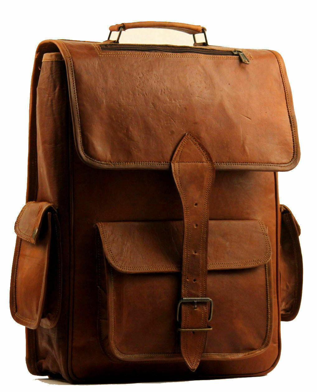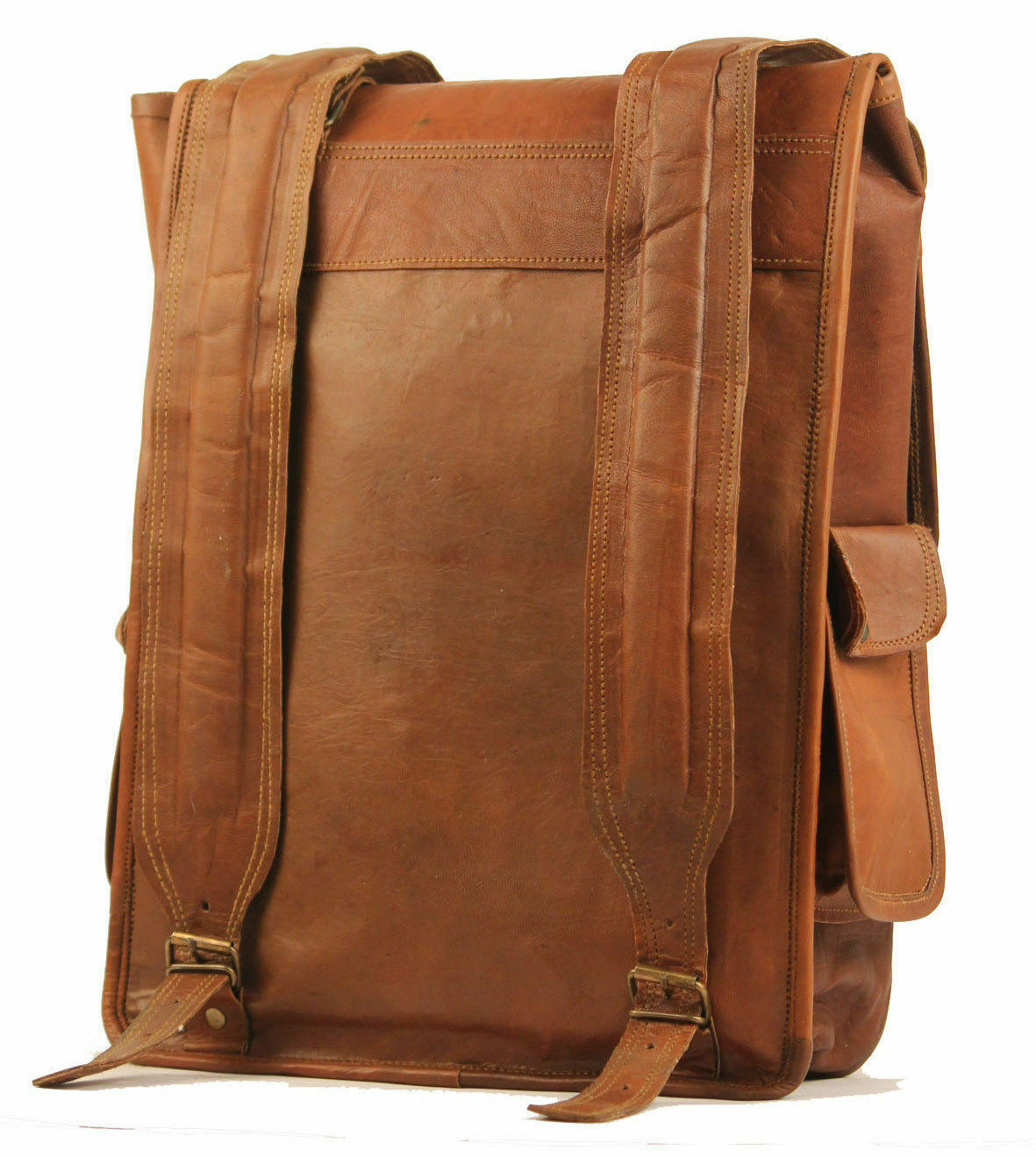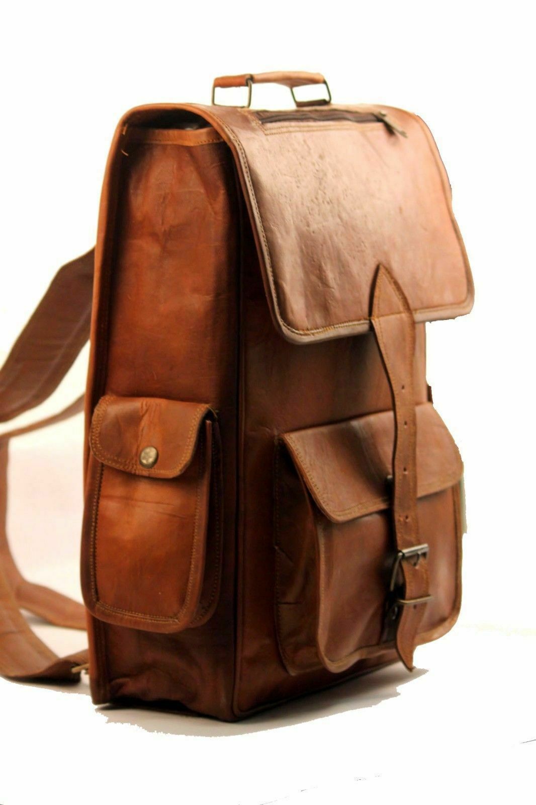 Item Description:- Material- Real Goat Leather Size- 16"(L), 14"(W) Made from 100% Genuine, Strong, lightweight, durable goat leather, tanned without the use of chemicals Adjustable back shoulder strap A protective over flap Big main compartments for clothing /travel and sports gear etc. 1 big pocket in front 2 small pockets in sides for cash /mobile 16" inch in size, perfectly suited for a carry all or as an overnight backpack bag Inside green canvas Specially ample with wide straps and lots of pockets secured with metal buckles