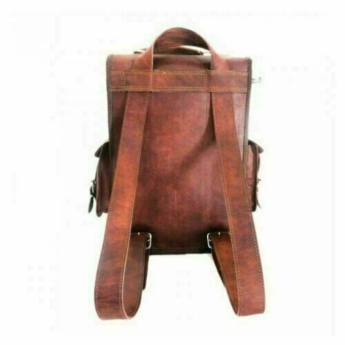 Mens Vintage Genuine Leather Satchel Laptop Backpack Rucksack Messenger Bag This product data sheet is originally written in English. Material- Real Goat hide ( sustained ) Bag Size- 11"(L), 15"(H), 4"(D) Front side 2 pockets and 2 pocket on side. Shoulder belt length- 70 inches long which convert into messenger and backpack also Total 3 compartments inside with green color strong canvas lining. Handle on top. Real Brass metal accessories used in this Bag. Made by professional and experienced artisans from Rajasthan. Treated by natural ingredients. Natural leather smell will go away within few days from the usage of this bag. Eco friendly and weather resistant. Made by experienced and talented Artisians from Rajasthan ( Jaipur ).