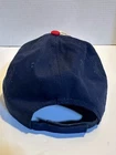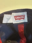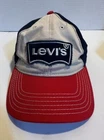 This is a vintage Levi's trucker hat in blue canvas, featuring a red, white, and blue design with a velcro back closure. It is a one size fits all style for men.