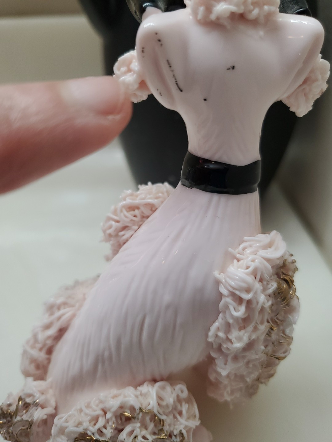 This vintage Lipper & Mann figurine features a charming pink spaghetti and noodle poodle wearing cat eye glasses. Crafted from porcelain, this collectible piece is perfect for dog lovers and poodle enthusiasts alike. The figurine is not handmade and has not been modified. The attention to detail in this piece is remarkable, from the intricate spaghetti strands to the cat eye glasses, making it a unique and rare addition to any collection. The poodle is the breed of dog featured in this figurine, and it falls under the animal class of dogs. This collectible is a must-have for anyone who loves dogs, poodles, or unique vintage figurines. Small black mark as seen in picture back of ear and head, but this might just be part of the color used on the collar, however I am not 100 percent sure.
