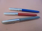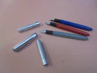 You are bidding on a lot of three WearEver fountain pens. The red and blue ones are identical except for color. I cannot see what the nibs say as they have a black piece that covers the name on the nibs. The gray one is a little different. The nib is marked Steno, 8365, USA". All three looked like they have never been used, if so sparingly. The red and blue one's covers have some corrosion or something like that. They are all in good plus condition. I combine shipping on multiple purchases.