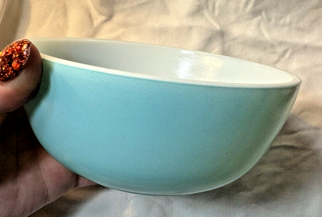 The bowl is in excellent condition. No scratches at all. The Hazel Atlas Blue really pops. If you have any questions please ask, thank you :)