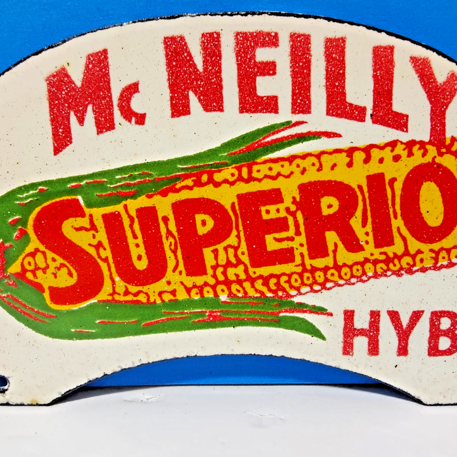 The product is a vintage McNeilly Superior Hybrids porcelain enamel sign, measuring 6" x 2.5" inches. This original advertising sign features a multi-color design with a theme focused on agriculture, making it a collectible piece from the United States. Perfect for seed and feed company collectors or enthusiasts of vintage agricultural advertising, this sign likely holds historical and nostalgic value for those interested in the branding and marketing tactics of McNeilly in the past.
