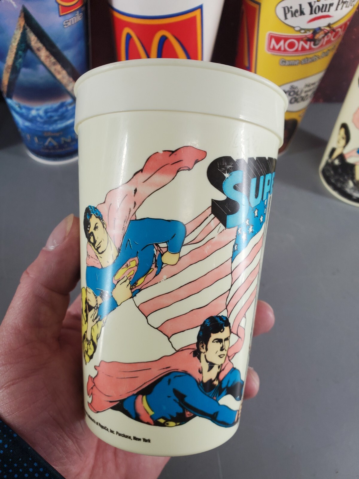 MCDONALDS LOT OF VINTAGE CUPS SUPERMAN 2 COCA COLA ATLANTIS MOVIE PROMOTIONAL Up for your consideration are these really cool vintage promotional McDonalds cups. Included with this set of cups is two Superman 2 cups from the 1980's, two Coca Cola cups from the year 2000, which under the cups state that they were made in Urbana IL. Along with those cups is one more additional McDonalds Monopoly cup from 2001, two Atlantis promotional cups from 2001. There is also one more yellow McDonalds cup from 2000. The total amount of cups included in this lot is 8. Please be sure to see our other listings! With nearly 2,000 items listed you may find something else you like. If you do message us to see if shipping can be combined and possibly save you money on shipping. FEATURES: Two Superman 2 cups, 2 Atlantis cups, 2 Coca Cola cups, two VTG McDonalds cups ADD. INFO: All cups included in this lot are vintage INCLUDED: The actual Mcdonalds cups pictured. NOT-INCLUDED: No original box, packaging, or paperwork. No batteries, bulbs, or any props used for size reference. BRAND: Mcdonald's LABEL: Various labels included on cups DIMENSIONS: The largest Coca Cola cup measures 4 1/8 th inch across the top of the cup, and approximately 7 inches tall, The Superman 2 cups measure about 3.5 inches across the top diameter of the cup, and the height is 5.5 inches COLOR: Multicolor TYPE: Large, Medium, Small MODEL #: N/A COPYRIGHT DATE: Various dates, none older than 2001 CIRCA: Likely the 1980's to 2001. COUNTRY: Likely made in America, The Coca Cola cups were made in Urbana IL MATERIAL: Plastic CONDITION: This comes to you in very good condition. Although on some of the cups there can be seen some minor wear, such as the Superman 2 cups. There are some places where the paint has been faded but only really on one of the Superman cups. The rest of the cups are in excellent condition. AUTHENTICITY and your SATISFACTION are UNCONDITIONALLY 100% GUARANTEED!!! Once you get it - if you are not thrilled just let us know - we gladly accept returns. Check our feedback and buy with complete confidence we have been selling on eBay everyday since 2001. SHIPPING DETAILS: The buyer pays for securely packed EXPEDITED shipping. It will include tracking and insurance. For premium services delivery to your address will usually take between 3 to 5 days. I will always combine shipping to save you money whenever possible, just email us to let us know. Please be sure to click on the shipping tab to compare rates and see all of the options available for shipping, some options cost less than others. SHIPPING CONDITIONS: *** Please Take Note!!! We can ONLY ship to the address that is included with your payment . If you need it sent to a different address please change that prior to making payment. LOC: A 2 You really like the thing, but not so much the price... We find cool stuff, do some research and list it for what wed think it's worth. Sounds pretty simple but sometimes not. So if this is something you really like but its a bit more than you had hoped to pay, then be sure to watch this because we can't send it to the bank, and if it ends without a buyer chances are good that we will drop the price and re-list it until it does sell! Two things for sure - it will get sold sooner rather than later, and that's better for both of us. International Buyers We will ship to most, but not all locations around the world. We use Priority Mail, and it will include full insurance and delivery confirmation. Unfortunately we do not ship using first class international mail because there is no insurance available. "Import Duties", "Tariffs" and "Taxes" are NOT included in the item price or shipping charges. These charges are imposed and collected by your country and are your responsibility. Please check with your country's customs office to determine what these additional costs (if any) will be prior to bidding/buying. These charges are normally collected by your customs office when you pick the item up or upon delivery ? please do not confuse them with shipping charges, they are not. Buyers using the Ebay Global Shipping Program will be shown these cost prior to purchase. We can NOT reduce the value on the "Customs Forms". The sales prices is automatically entered and also sets the maximum amount that the item can be insured for. We can not mark items purchased by you as "gifts". Some countries restrict or prohibit the import of certain items such as currency - jewelry or animal parts such as teeth, claws, horns or shells from many creature on the endangered specie list. The lists varies widely and changes often. It is your responsibility to check and make sure your country allows this specific item to be imported by you. We take a great deal of pride in our feedback rating and never want you surprised by anything you get from us. PLEASE If there is ever an issue, all we ask is that you give us an opportunity to address it BEFORE leaving feedback. Overall General Condition New Excellent Very Good Good Fair Poor Appearance Brand new and never used. No visible flaws in appearance. First quality, suitable for a gift. Like new condition. Upon close inspection some very minor signs of use or wear, but no serious flaws. Obviously used but kept in great conditional and well cared for. Expected normal signs of wear but no abuse. Clearly used allot, enough to cause significant signs of wear. See item description for more details on further future use. Used extensively, many cosmetic flaws and signs of wear. Questionable functionality Sold "AS IS" Used extensively with abundant and major cosmetic flaws. Likely non- functional. Sold "AS IS" for decorative use only. HUGE eBay STORE; If you liked this item, then you should take a look at some of the other items we have listed, some listings are "Buy-It-Now" and may even have a "best offer" and occasionally go on sale. It's a "virtual treasure trove" crammed full of 100's & 100's of old, new, odd & unusual items!!