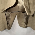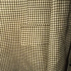 This Vintage Men's Burberry Herringbone Houndstooth Blazer in size 42R is a stylish addition to any man's wardrobe. Made in the USA, this beige blazer features a classic herringbone pattern, a four-button sleeve button style, and a flat front design. The double-vented back adds a touch of sophistication, while the inner pockets provide functionality. This blazer is perfect for a business occasion and showcases the quality and style that Burberry is known for. With proper care through dry cleaning, this timeless piece will continue to elevate any outfit for years to come. THERE IS A SMALL INK STAIN INSIDE THE BLAZER. I TOOK A PICTURE OF IT NEXT TO A PEN TO GET AN IDEA OF THE SIZE. IT’S ABOUT AN INCH AND A HALF. IT DOES NOT SHOW ON THE OUTSIDE AND WITH DRY CLEANING MAY POSSIBLY BE ABLE TO GET REMOVED .