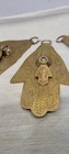 This vintage Moroccan double Hamsa amulet brass talisman wall hanging set of 3 is handmade and features a design rooted in Judaism. The intricate brass work reflects the cultural and religious influences of Morocco, making it a unique and symbolic piece for collectors of Judaica or spiritual items.