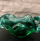 This is a vintage Murano glass bowl by Barovier Toso, originating from Murano, Italy. The bowl is round with a floriform shape and features a green rolled edge. It is hand blown and measures 8.6 inches in length and 4 inches in height. The bowl is part of the Mid-Century Modern style, with a limited edition decorative design suitable for use as a fruit bowl, console dish, or centerpiece.