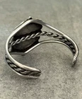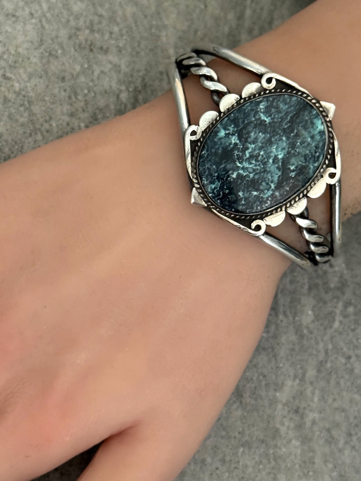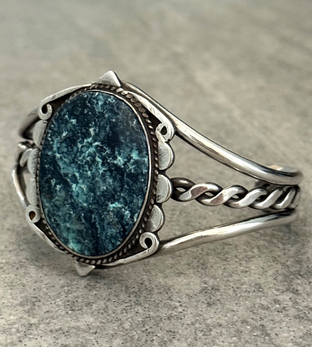 This is an amazing Old Vintage Navajo sterling silver bracelet. This eye-catching bracelet features natural Beautiful turquoise gem stone.Stone is surrounded with hand carved silver rope,swirl stems and silver half circles.Triple Ingot silver wire shank bracelet contains hand twisted silver rope. OLD PIECE. *EACH PIECE OF OUR COLLECTION IS CLEANSED WITH WHITE SAGE INCENSE. *Please Note-All Native American jewelry pieces are tested and guaranteed, any piece referred to as Silver or Sterling is guaranteed to be minimum of 90% /Coin silver or possibly higher content. The inside measurement from tip to tip is approximately 5 1/4" and the opening measurement between the tip is approximately 1-1/4" Approximate width of the bracelet is 2-1/2"(across inside). Approximate size of the stone is 1-1/4"L,1"W(measured from center of the stone). Sturdy 44.3 grams in my scale. ADJUSTABLE & STACKABLE Bracelet !!! This bracelet would be a great addition to any Native American or Southwestern jewelry collection. Also this amazing bracelet is a timeless beauty with lots of good energy! SMOKE AND PET FREE ENVIRONMENT. If you have any question please contact me via eBay messages and PLEASE CHECK MY OTHER LISTINGS AS WELL! THANK YOU FOR STOPPING BY!
