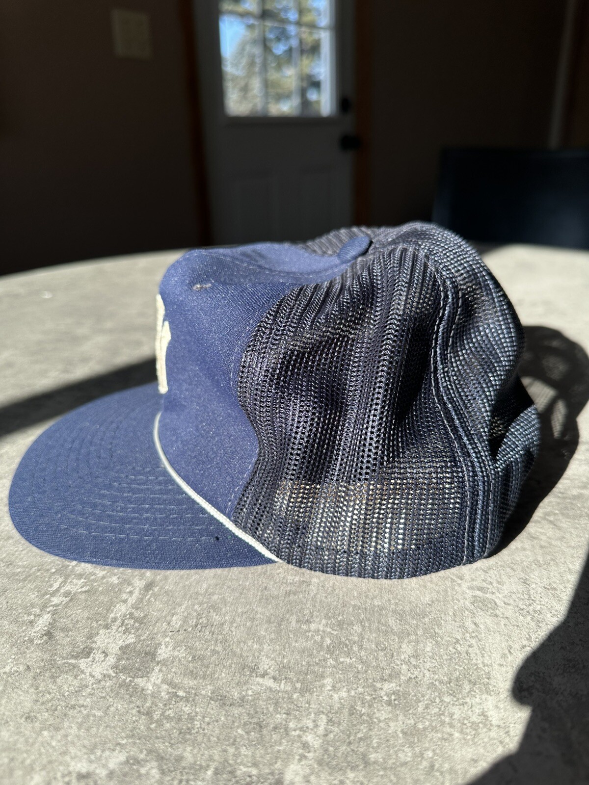 Vintage New York Yankees Hat Snapback MLB Baseball Large Blue Trucker W/ String. Condition is Used. Shipped with USPS Ground Advantage.