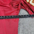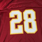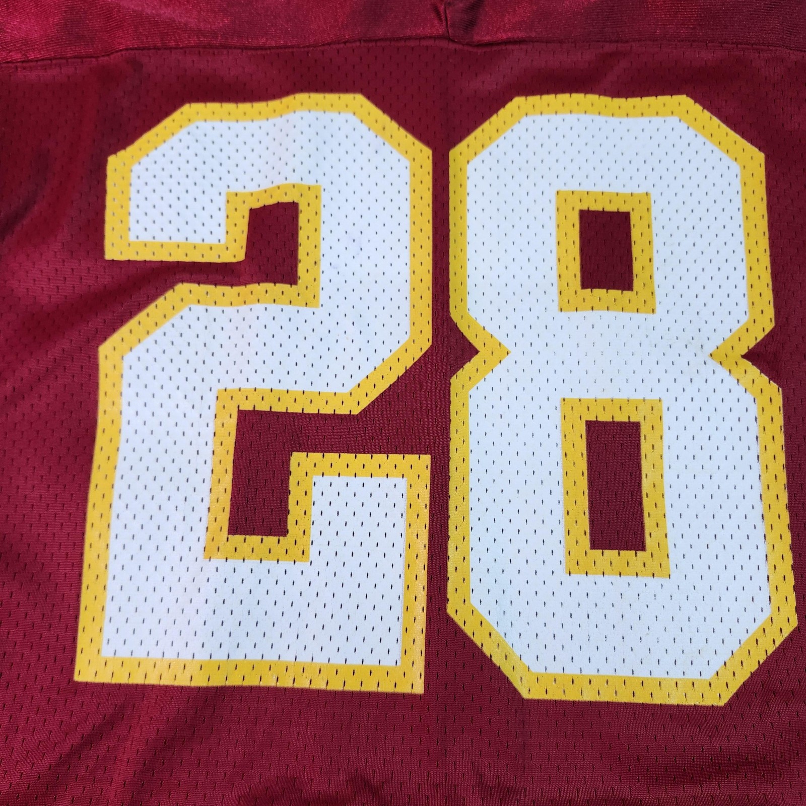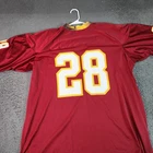 Brand: Nike. Style: Mens short sleeve football jersey shirt from the Nike Team Sports line. Color: Deep red body with white and yellow number graphics and multicolor red and yellow collar trim. Size: Mens XL (interior neck label and front jock tag both marked XL). Material: Lightweight breathable polyester mesh fabric with smooth woven shoulder yoke. Country of origin: USA (per interior tag). Front details: Large perforated white 28 numerals with yellow outline across the chest, embroidered gold Nike Swoosh at right chest, patterned V-neck collar in red and gold tones, and Nike Team Sports woven jock tag at lower left hem with ENGINEERED TO THE EXACT SPECIFICATIONS OF CHAMPIONSHIP ATHLETES text. Back and sleeve details: Matching large 28 graphic centered on the back and smaller 28 graphics on both sleeves for a classic gridiron look. Features: Pullover construction, relaxed fit silhouette, breathable mesh body for ventilation, short raglan-style sleeves for full range of motion, bold double-sided number graphics, ideal for football fans, collectors, or casual athletic wear.