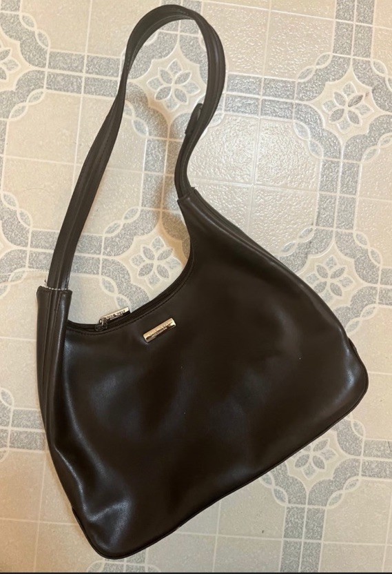 This vintage Nine West shoulder bag is a classic accessory that perfectly captures a minimalist Y2K or 90s aesthetic. Crafted from sleek black faux leather, the bag features a compact hobo-style silhouette with a secure top zipper closure. The front is accented with a polished silver-tone Nine West logo plate and detailed vertical stitching that adds subtle structure and style. Its slim profile and single strap make it an ideal choice for comfortable over-the-shoulder wear, fitting seamlessly under the arm. Whether you're looking for a versatile everyday purse or a nostalgic "baguette" style piece, this chic and lightweight bag is a timeless addition to any collection