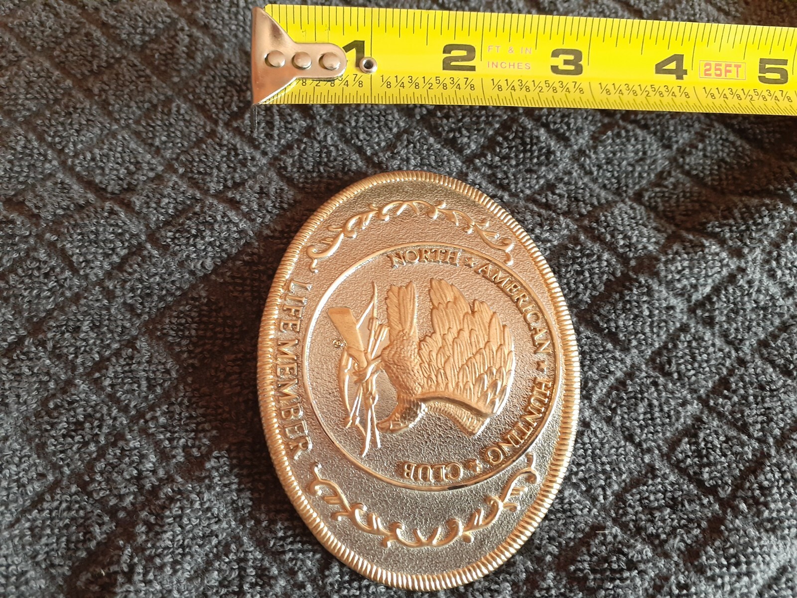BELT BUCKLE, North American Hunting Club "Wings of Gold" Life Member, vintage. Gold toned, features the NAHC eagle logo and the Life Member designation. This vintage piece is in excellent condition, having never been worn. Slide for belt features interior dimension of 1.75" on the silver toned back. Dimensions: approx. 4" x 3" and weighs 3.7 oz.