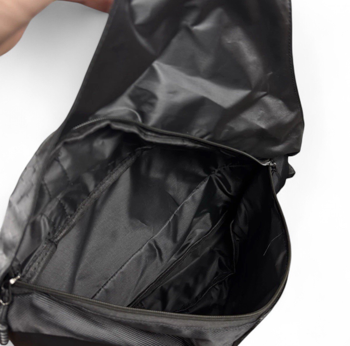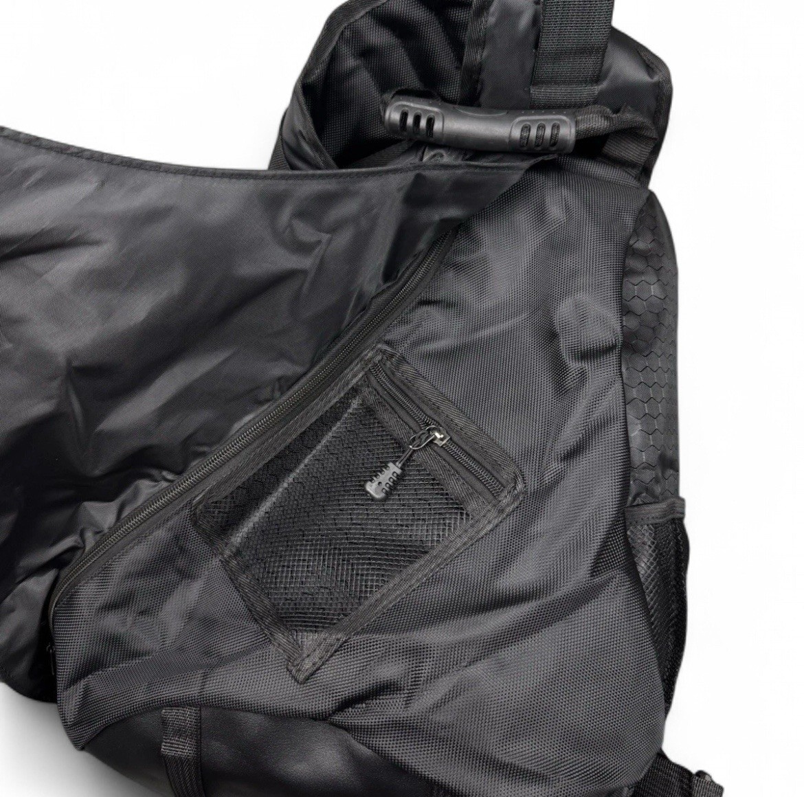 The Vintage Oakley Style Crossbody Sling Bag is a large, solid black nylon bag with a canvas fabric lining. It features a zip closure, adjustable nylon strap, and is perfect for travel or casual occasions. This Y2K 90s themed bag is designed for men it is a stylish and versatile accessory for any modern man looking to add a touch of vintage flair to their outfit.