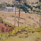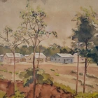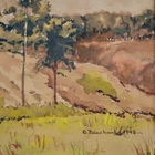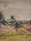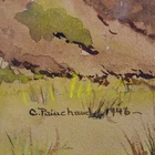The Vintage ( Circa.1946 ) Framed Original New England Landscape Watercolor Painting on Paper "Rural Scenery" , Signed and Dated By Artist C. Painchaud in Lower Right. This Painting is Beautiful Executed with Delicate Washes of Color, Capturing A Serene and Peaceful Rural Scene with Cluster of Houses, Trees and Greenery Field Under the Cloudy Day. The Use of Watercolor Gives the Painting A Soft, Muted Quality, with A Focus on the Natural Elements of the Scene. The Color Palette is Earthy, with Browns, Greens, and Hints of Yellow, and Warm Tones and Loose Brushstrokes Evoke A Sense of Tranquility and the Passage of Time. The Painting in Good Condition Shows Toning, Dirt on the Mat and Scratches on the Frame Consistent with Age. Title: "Rural Scenery" Artist: C. Painchaud Time Period: 1946 Medium: Watercolor on Paper Condition: Good Condition Frame Size: 22" By 18-1/4" Sight Size: 15-1/2" By 11-1/4" Available For Domestic Shipping and International Shipping. Thanks!