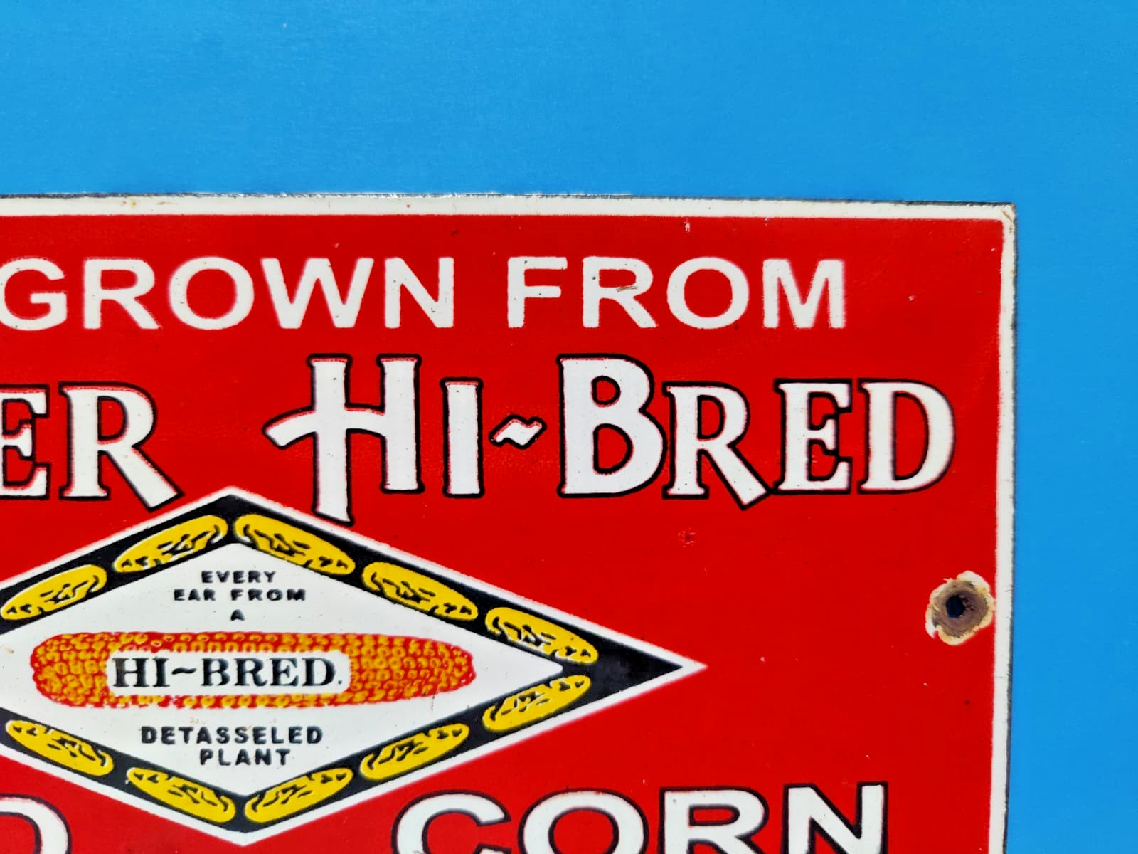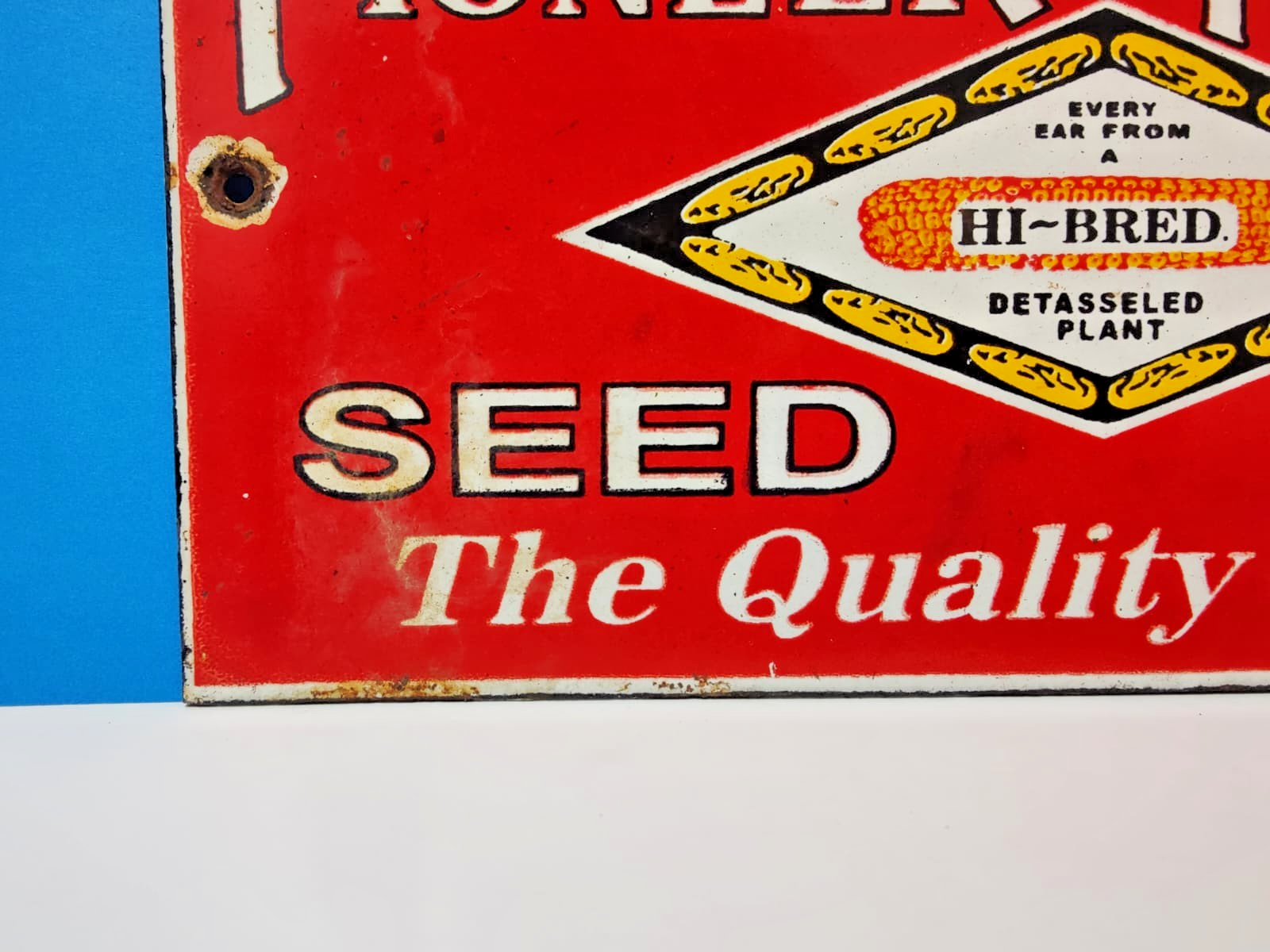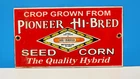 The product is a vintage Pioneer Hi-Bred Seed Corn farm porcelain enamel sign, measuring 9" x 5" inches. This original advertising piece features a multi-color design, with a theme focused on agriculture. It is a collectible item that represents the United States and the Pioneer brand in the seed and feed industry. This nostalgic sign would make a great addition to any vintage collection or farm-themed decor.