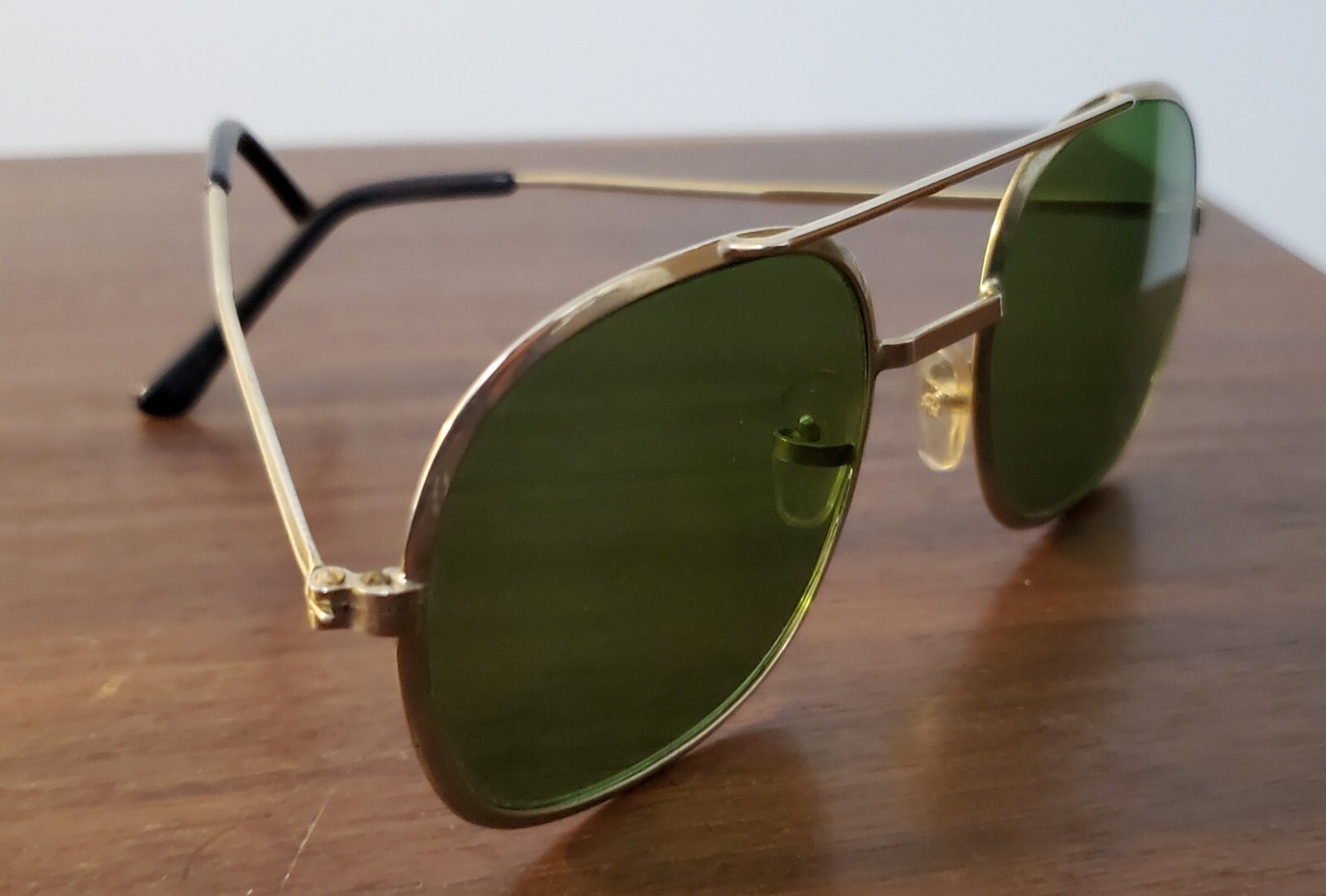 Vintage Metal Aviator Sunglasses with Green Lenses The aviator sunglasses with green lenses are in good used vintage condition. The lenses might have a few minor scratches and the frame will need some adjusting, but overall in good condition. See photos, which are part of the listing.