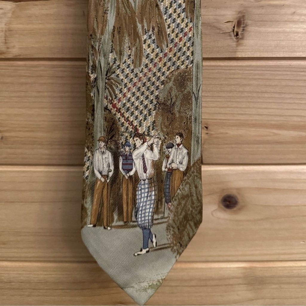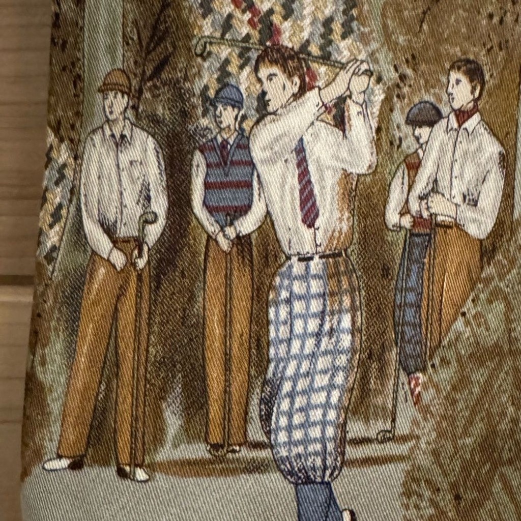 Neutral Color Vintage Golf Scene Silk Tie Made In USA No Holes Or Stains Seen Length: 60