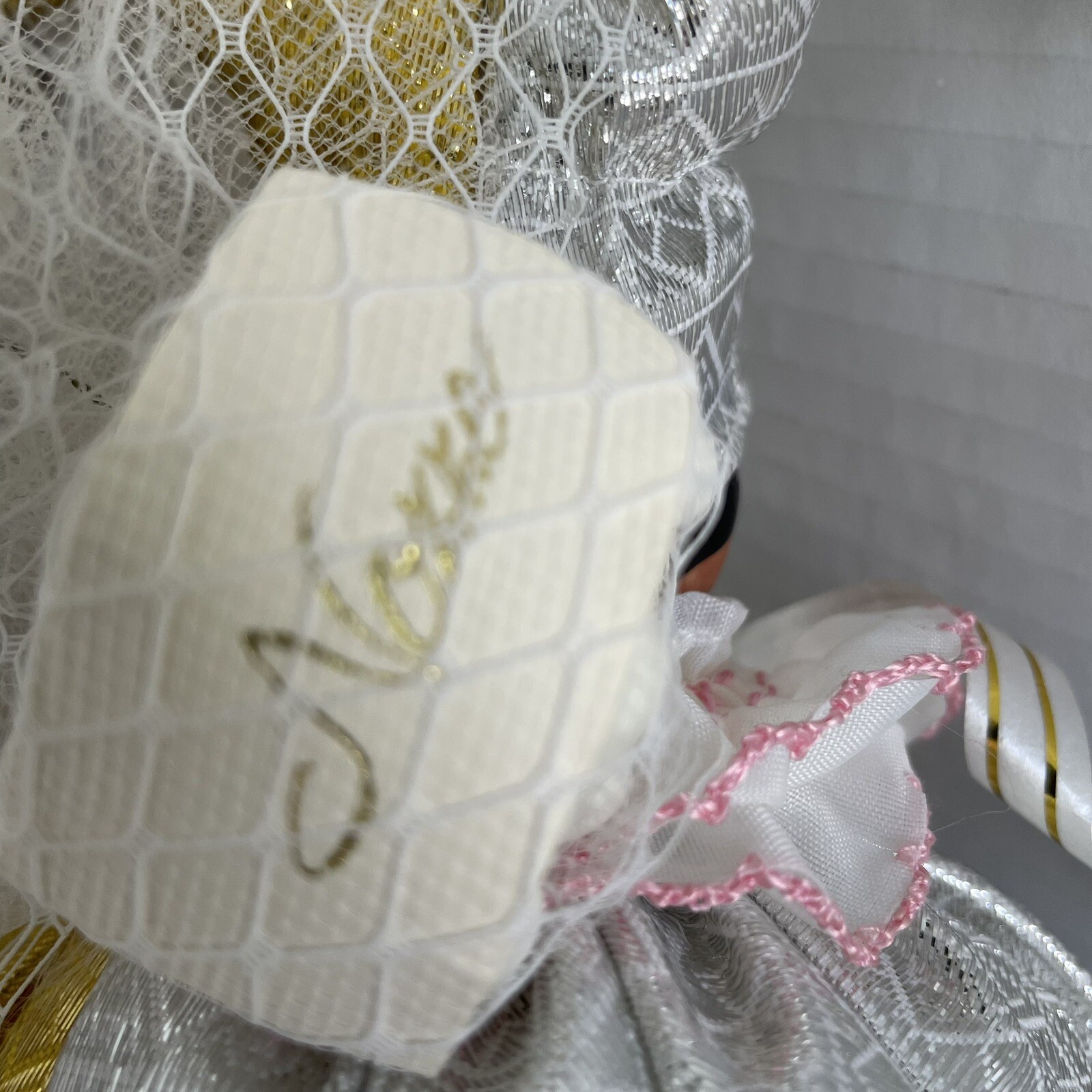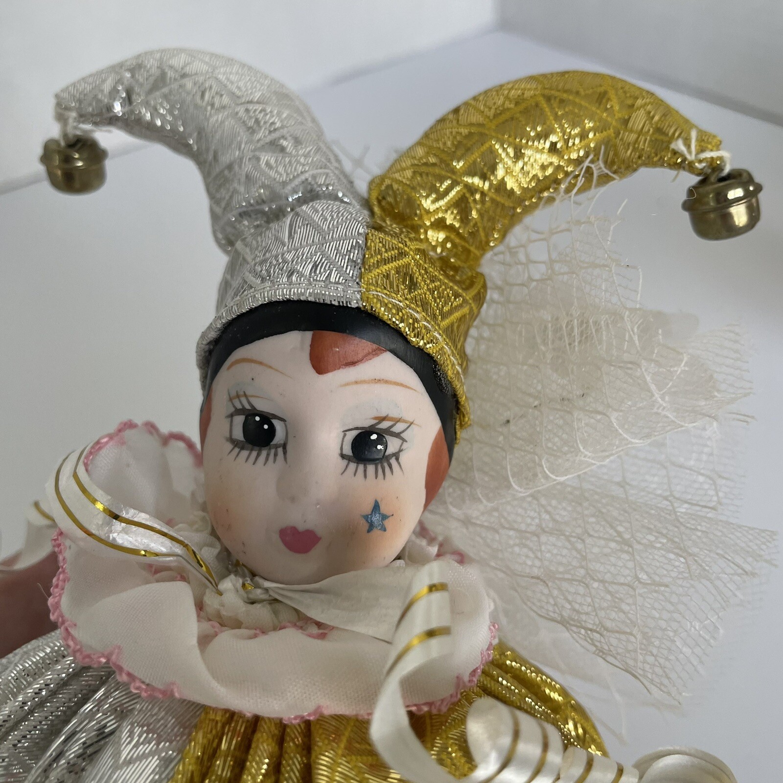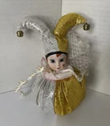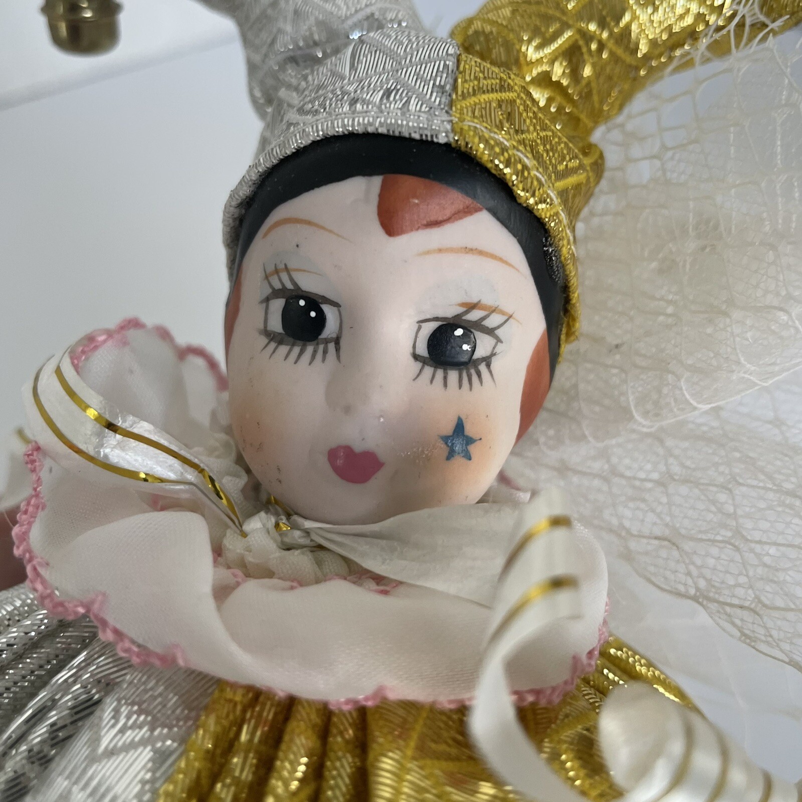 This vintage Porcelain Harlequin Mardi Gras Doll Pincushion Pierrot Jester is a charming addition to any doll collection. Standing at 6 inches tall with a soft porcelain body, this doll features a unique jester outfit, hat, and star on its face. Perfect for collectors aged 17 years and up, this gender-neutral doll is a whimsical and nostalgic piece that would be a great addition to any Christmas display or vintage-themed decor. Its brown hair and black eyes add to its vintage appeal, making it a must-have for those who appreciate classic and timeless dolls.