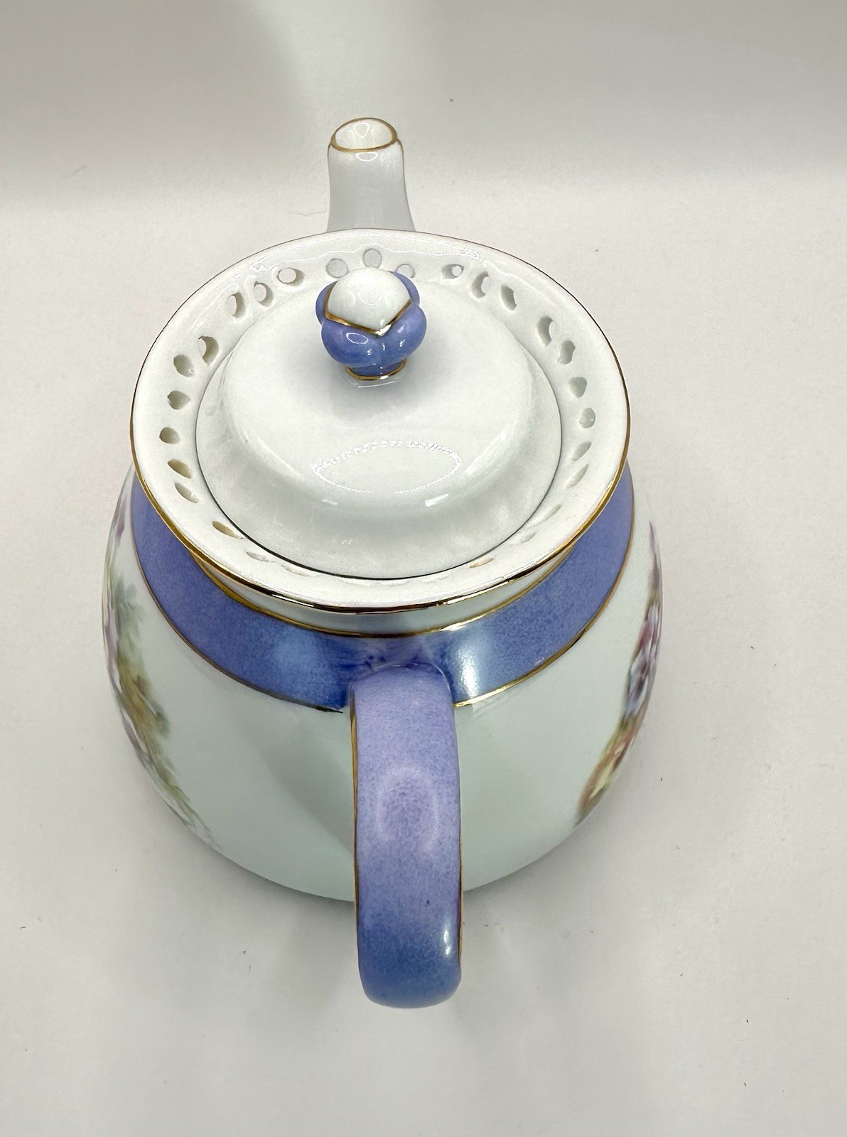 Porcelain Treasures , Betty Platner Designed, hand decorated floral teapot purple gold trim glossy finish. Design: It features a hand-painted or transfer floral pattern of pansies in shades of purple, yellow, and blue, set against a white porcelain body. The top portion of the teapot and the lid have a distinct lavender or purple lusterware band. Accents: The piece is finished with gold trim on the rim, spout, handle, and the decorative finial on the lid. Usage: Based on its size and design, it is often referred to as a "one-cup" or mini teapot. Very good pre-owned vintage condition without chips or cracks ( see photos)