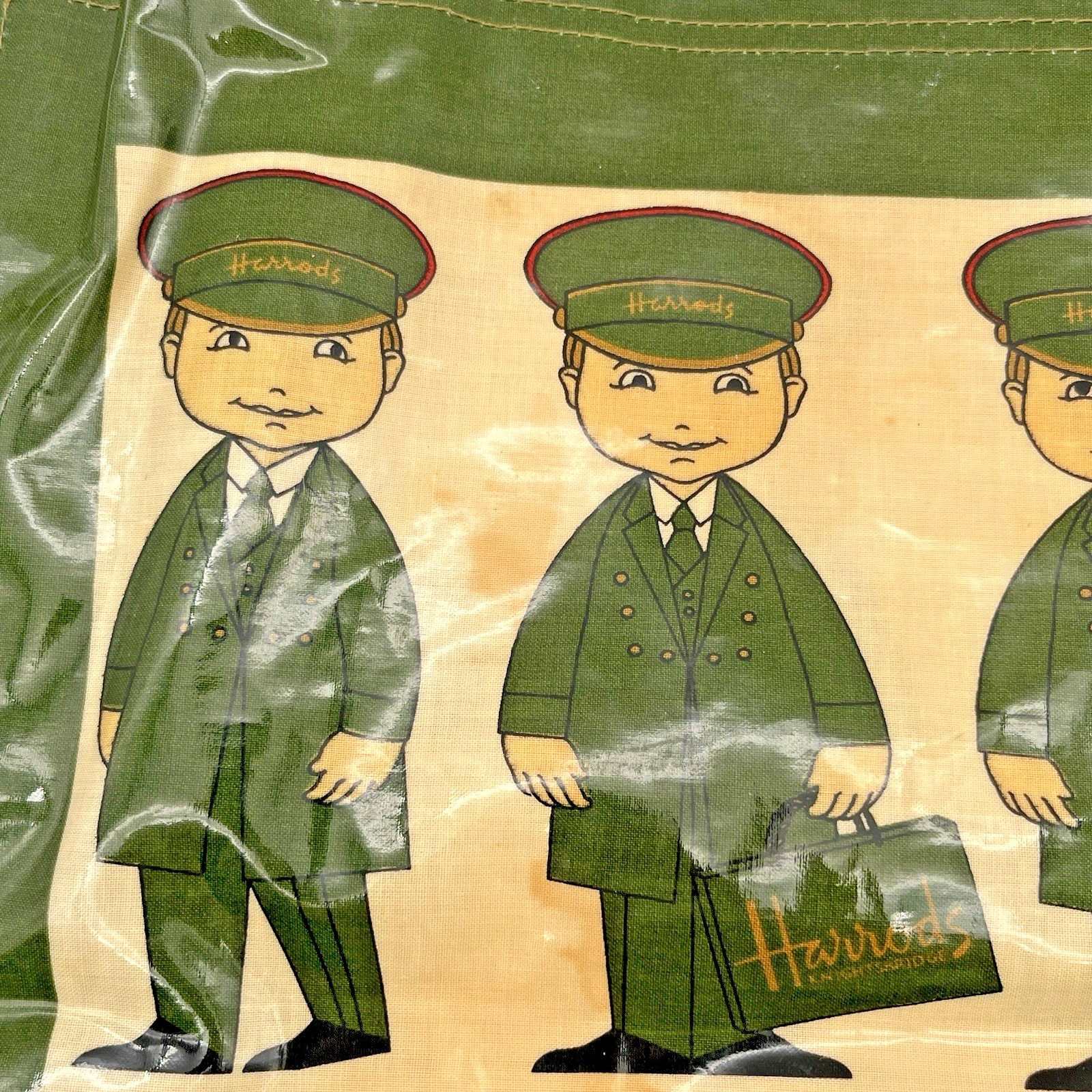 You are buying a: Vintage RARE Harrods Shopping Tote Bag Green Doorman London UK Original Oilcloth Measurements: 15" x 17" 5" Bag is functional with no stains or rips but there are some visible stains on the outside; please see pictures before purchasing. Please see photos we take of each item received for its condition . We do our best to describe or mention any defects. We want you to be happy with your purchase, so ask questions before purchasing! FAST Shipping ! Orders carefully packaged Please message if you have questions!