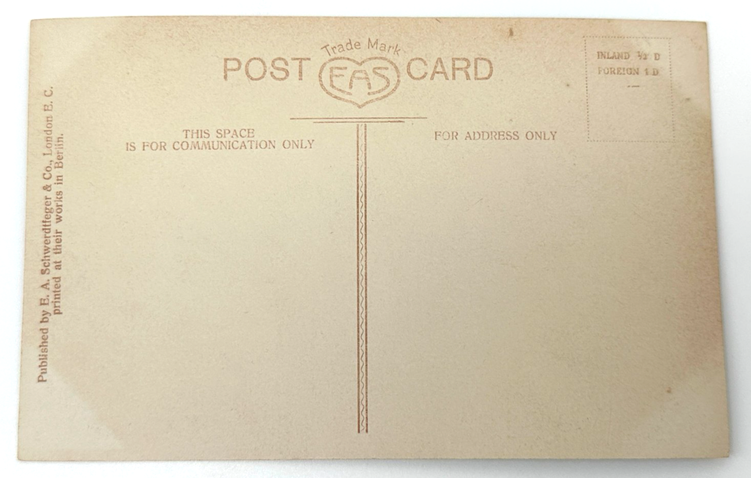 Historic early view postcard of the Bull Ring in Birmingham, England. Shows bustling street life with horse-drawn carts, pedestrians, and the iconic spire of St. Martin’s Church. Published by E.A. Schwerdtfeger & Co. of London. A rare glimpse into early 20th-century Birmingham city life.