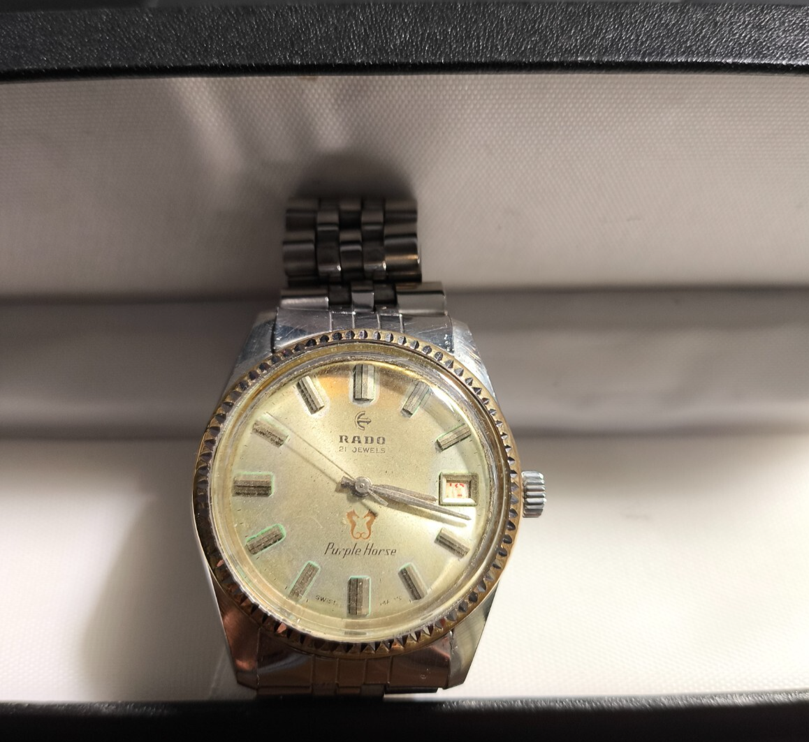 This vintage Rado Purple Horse watch is a stunning piece of Swiss craftsmanship! The automatic movement with 21 jewels keeps perfect time, and the iconic purple horse dial adds a unique retro charm. The stainless steel case has a classic, well-loved look that tells its own story. It’s a true collector’s item—elegant, reliable, and full of character. If you love timeless watches with history, this one won’t disappoint!