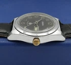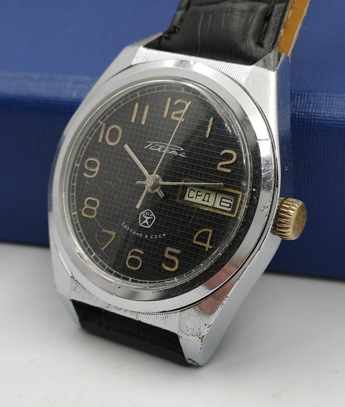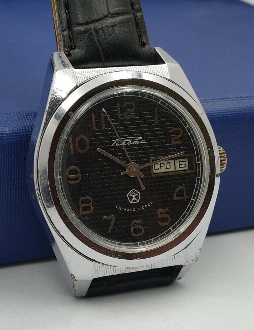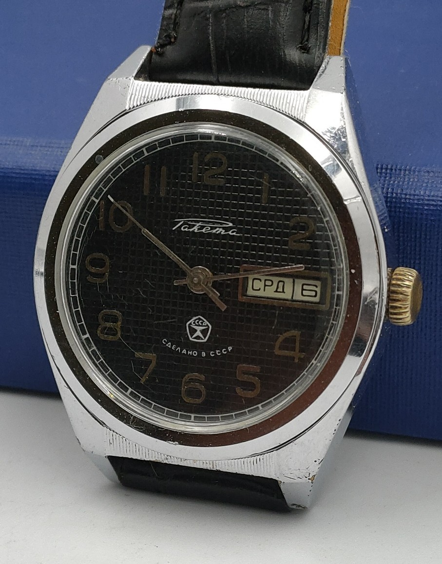 Brand:RaketaBezel Type:Fixed, FlutedStyle:Casual, Classic, Dress/Formal, LuxuryHandedness:LeftHandmade:NoFeatures:12-Hour Dial, Day/Date, Seconds Hand, Shock-ResistantCase Finish:ChromeDial Color:ChampagneBand Color:BlackCountry/Region of Manufacture:UkraineCase Material:BrassDisplay:AnalogYear Manufactured:1980-1989With Papers:NoCase Color:SilverBand Material:Faux LeatherLug Width:18 mmBand Width:18 mmCaseback:SnapCustomized:NoIndices:Arrow MarkersNumber of Jewels:19 JewelsWith Original Box/Packaging:NoBand/Strap:BangleSeller Notes:“The watch is in full working order and has been serviced by a watchmaker.”Movement:Mechanical (Manual)Seller Warranty:NoWater Resistance:3 m (0.3 ATM)Department:MenModel:2628Type:WristwatchVintage:YesWith Service Records:NoWith Manual/Booklet:NoWatch Shape:RoundDial Pattern:LogoBezel Color:SilverTheme:CelebrityCase Size:37 mmReference Number:2628