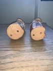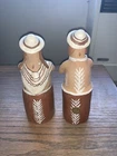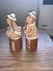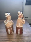 Vintage Raquel's Collection, Peruvian Handmade Clay Figurines, Flutist & Admirer. These beautiful hand-crafted folk art clay figurines come from Raquel's Collection from Peu, circa 1980s. They are painted with different shades of brown and white. They stand at about 8.75" tall and 2.5" in length and width. They have the expected imperfections of a piece of folk art molded and painted by hand.