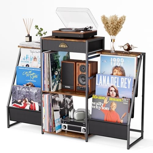 Return Policy Fast Delivery Trusted seller Record Player Stand with Vinyl Storage – Record Table with Holder,6-Bin Vinyl Storage Rack & Drawer, Dual Side Display Shelves,Holds 200+ Albums,Turntable Stand for Living Room, Bedroom Product Description Extra-Large Record Storage:This record player stand includes 6 Oxford fabric bins and 3 wooden shelves, holding up to 200 vinyl records. Perfect for organizing and displaying your collection with easy access from both sides. Multifunctional Storage Layout:The 3-tier record player table offers dedicated spaces for vinyl records, magazines, speakers, and accessories. The top surface securely fits most turntables or all-in-one record players. Built-In Drawer for Accessories:A convenient drawer sits under the top shelf—ideal for storing cables, remotes, headphones,vinyl cleaning kits, and extra styluses. Keeps your record holder neat and clutter-free. Decorative Side Shelves:Show off your personal style with candles, dried flowers, or diffusers on the side shelves—adding warmth and character to your vinyl record storage area and enhancing the atmosp of your listening space. Sturdy Build & Easy Assembly:Crafted from retro wood shelves and a black steel frame, this turntable stand combines vintage style with solid durability. Quick and easy to assemble with step-by-step instructions included. Shipping Returns Payment Shipping Shipping is FREE to all addresses other than APO/PO boxes in the lower 48 states. All our stock ships from US-based warehouses. Shipped via USPS or UPS (depending on location and package weight) Unless stated otherwise, all orders will ship within 24-72 hours of your payment being processed. Check our feedback to see the great reviews of FAST shipping we offer. Returns Seller does not accept returns Payment We currently accept payment via eBay managed payments only. Once payment is cleared, we will dispatch your shipment within 1-3 business days. Please refer to the "Shipping" tab for more information regarding shipping speed to your destination.