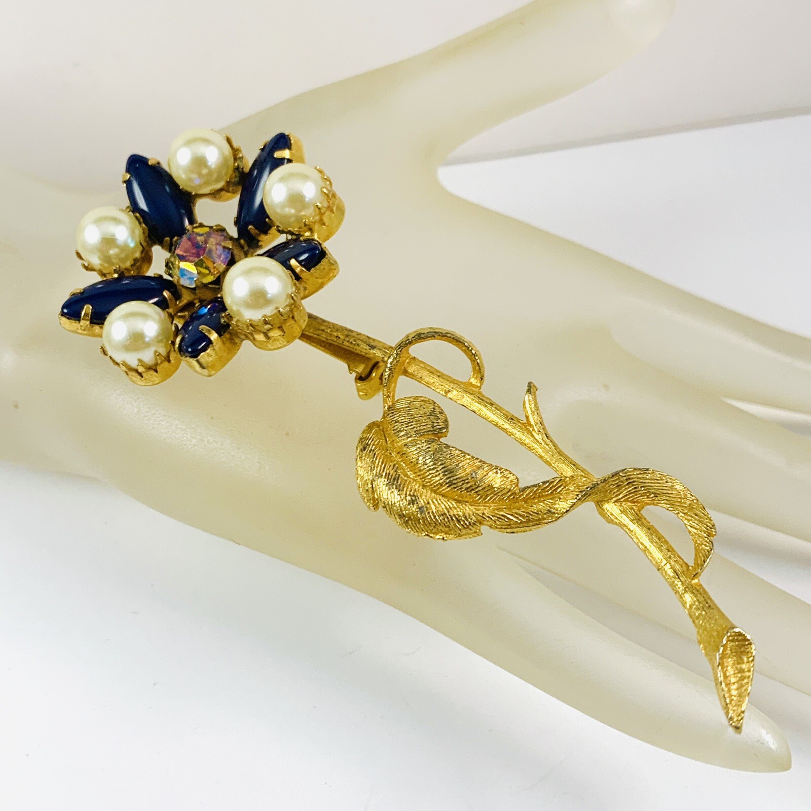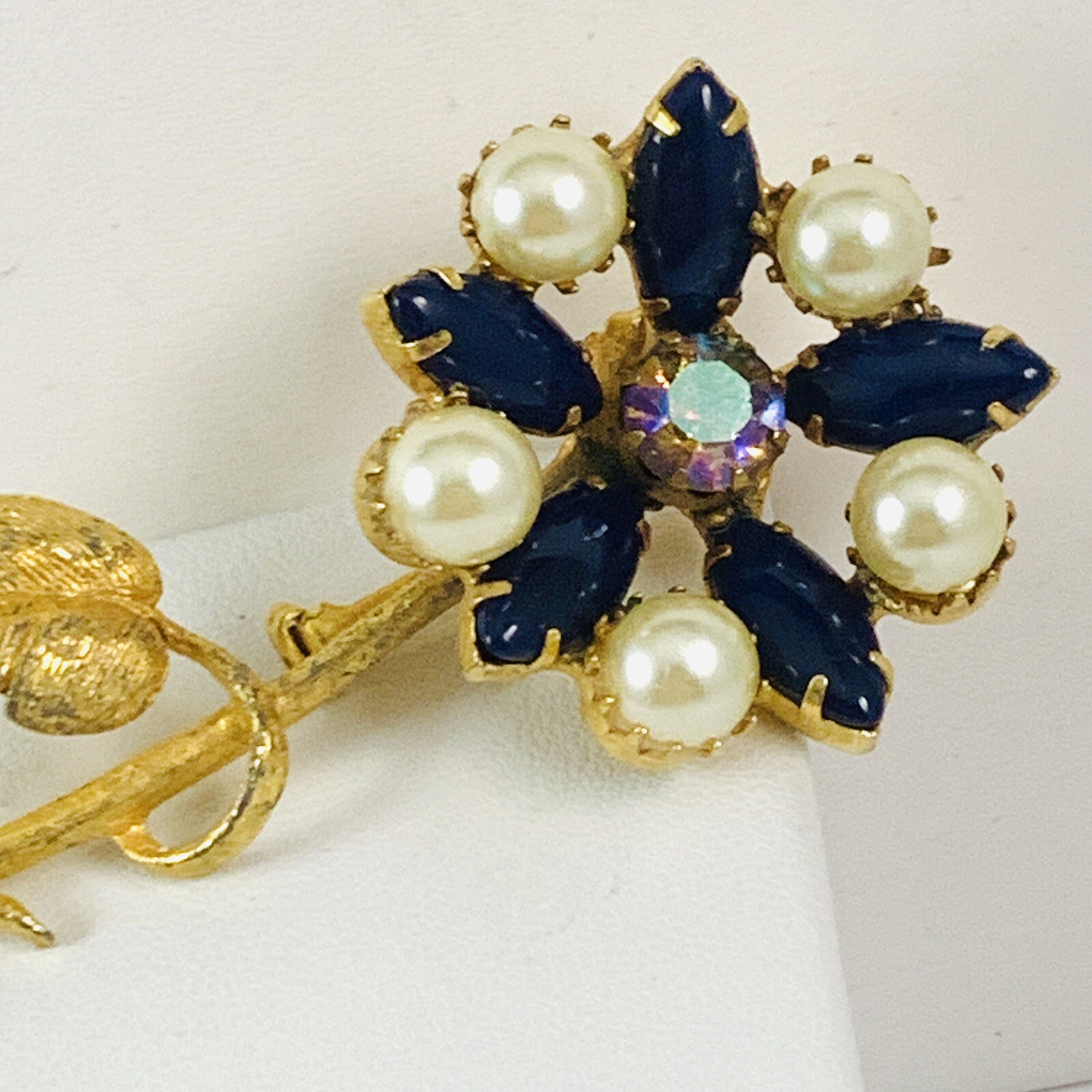 Gorgeous Vintage Long Stem Faux Pearl Navy Blue Glass Cabochons with a Aurora Borealis Rhinestone Center Gold Tone Flower Brooch. Pre-Owned Estate Jewelry in Very Good Condition. Ready to wear, give as gift or add to a collection. Our Vintage items are mostly from estate sales and vary in age from 100+ years old to more modern pieces. Please use your judgement. Items are photographed on a measuring matte with one-inch squares to give you an idea of size. Any photography props / holders you see are not included.