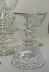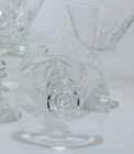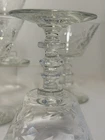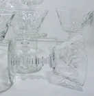 Elegant set of ten vintage clear glass champagne coupes by Rock Sharpe, featuring a beautifully etched leaf motif and distinctive stacked stem design. These glasses have a refined silhouette with just enough detail to feel special without being overly ornate. Rock Sharpe was an American glassware manufacturer known for its decorative etched patterns, particularly popular during the mid-20th century. Their stemware often featured floral and leaf motifs paired with sculptural stems, making their pieces both functional and visually striking. This pattern is sometimes associated with names such as Empire Wreath or similar leaf designs and was produced in multiple forms, including champagne coupes and tall sherbet glasses. These versatile coupes work perfectly for champagne, cocktails, desserts, or as elegant display pieces. A timeless set ideal for vintage entertaining, special occasions, or collectors of classic American glass. ⸻ Details • Maker: Rock Sharpe • Material: Clear etched glass • Pattern: Etched leaf / wreath motif • Quantity: Set of 10 • Style: Champagne coupe / tall sherbet • Era: Mid-20th century ⸻ Measurements (approx.) • Height: ~5 inches • Rim Diameter: ~4 inches • Base Diameter: ~3 ½ inches ⸻ Condition Very good vintage condition. No chips or cracks noted. Light surface wear consistent with age and careful use.