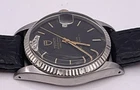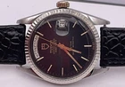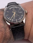 A lovely vintage mens Rolex Tudor Day Date automatic wristwatch The watch has been to my watchmaker and serviced see last picture part of the process etc Stainless steel case with fluted bezel, stainless steel screw back Black dial with gold raised markers and gold hands with sweeping seconds hand Day at 12 o’clock and date at 3 o’clock Gold Rolex screw down crown The watch is in very good working order and extremely accurate on timegrapher 25 rubies automatic movement with a frequency of 28800 beats per hour A new leather strap has been fitted Case reference 9450 See pictures for number reference between lugs Plexiglass lens with cyclops magnifier over the date Watch diameter measurement is 35mm including crown 38.5mm Watch thickness is 12mm Thanks for looking and see my other watches