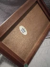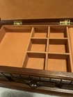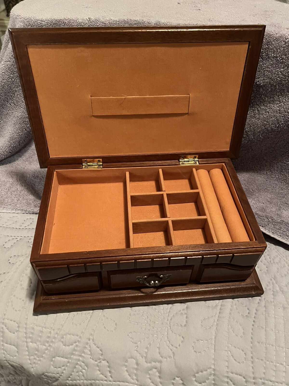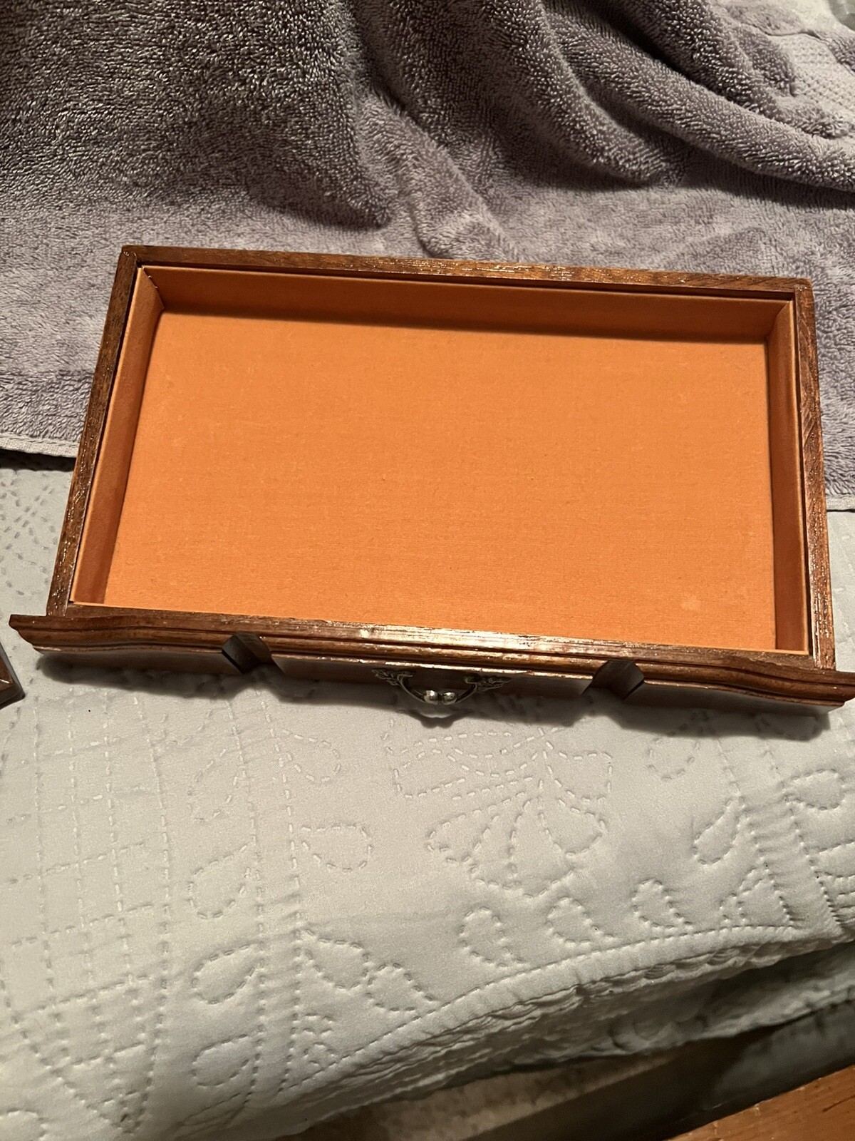 I see other Rosalco but none exactly like this! 1st, it is so clean. 2nd, it has the carving on top. And, 3rd it is large. Vintage Rosalco Commodore Wood Jewelry Box. Date comes up late 1980’s. Pretty top carved Ship with bird, waves and cloud details. Double layered with pull out drawer. Lots of storage area for your jewelry. Pretty golden orange color inside. No damage anywhere. Nice Estate sale find!