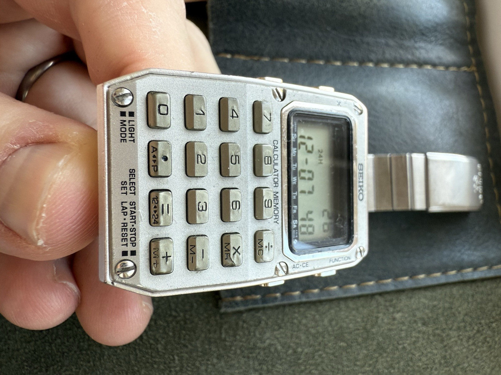 The SEIKO Calculator MEMORY C515-5009 Vintage DIGITAL ALARM CHRONO Mens Watch is a vintage timepiece with a digital display and a variety of features. This men's watch has a stainless steel case with a round shape and a bracelet band. The watch includes a chronometer, date indicator, backlight, alarm, and calculator functions, making it suitable for everyday wear as well as for those who appreciate unique and functional timepieces. The watch is from Japan and has a pilot/aviator, sport, and military style, making it a versatile and distinctive accessory for any collection.