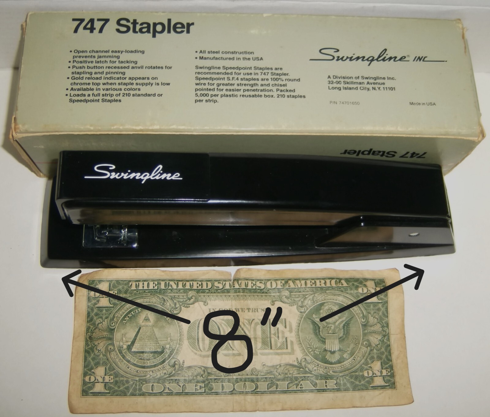 Estate Dispersal - Classic, Durable, Metal SWINGLINE 747 STAPLER USA - Commercial Office Supply - Used for paper closed, or, open for 'tacking' - Retro Vintage Black - Introduced 1968-1970s - 8" long - Old shelf soiled box - Tested (see photos). See other items 0807ex1p4