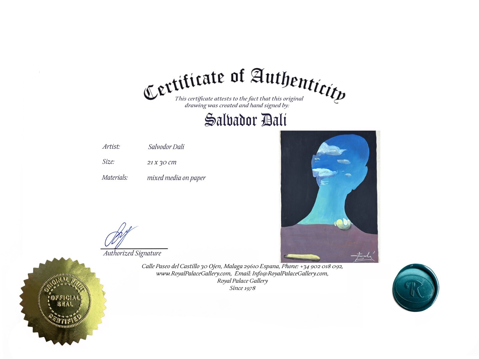 This original Salvador Dali drawing is a stunning piece! The mixed media work feels authentic and detailed, with a hand-signed front and gallery stamps on the back. The included certificate adds value, and the flat packaging ensures safe delivery. At $70 including shipping, it's a steal for a genuine Dali artwork. The 21x30cm size is perfect for display, and the seller's transparency about pricing makes the purchase trustworthy. A must-have for art collectors!