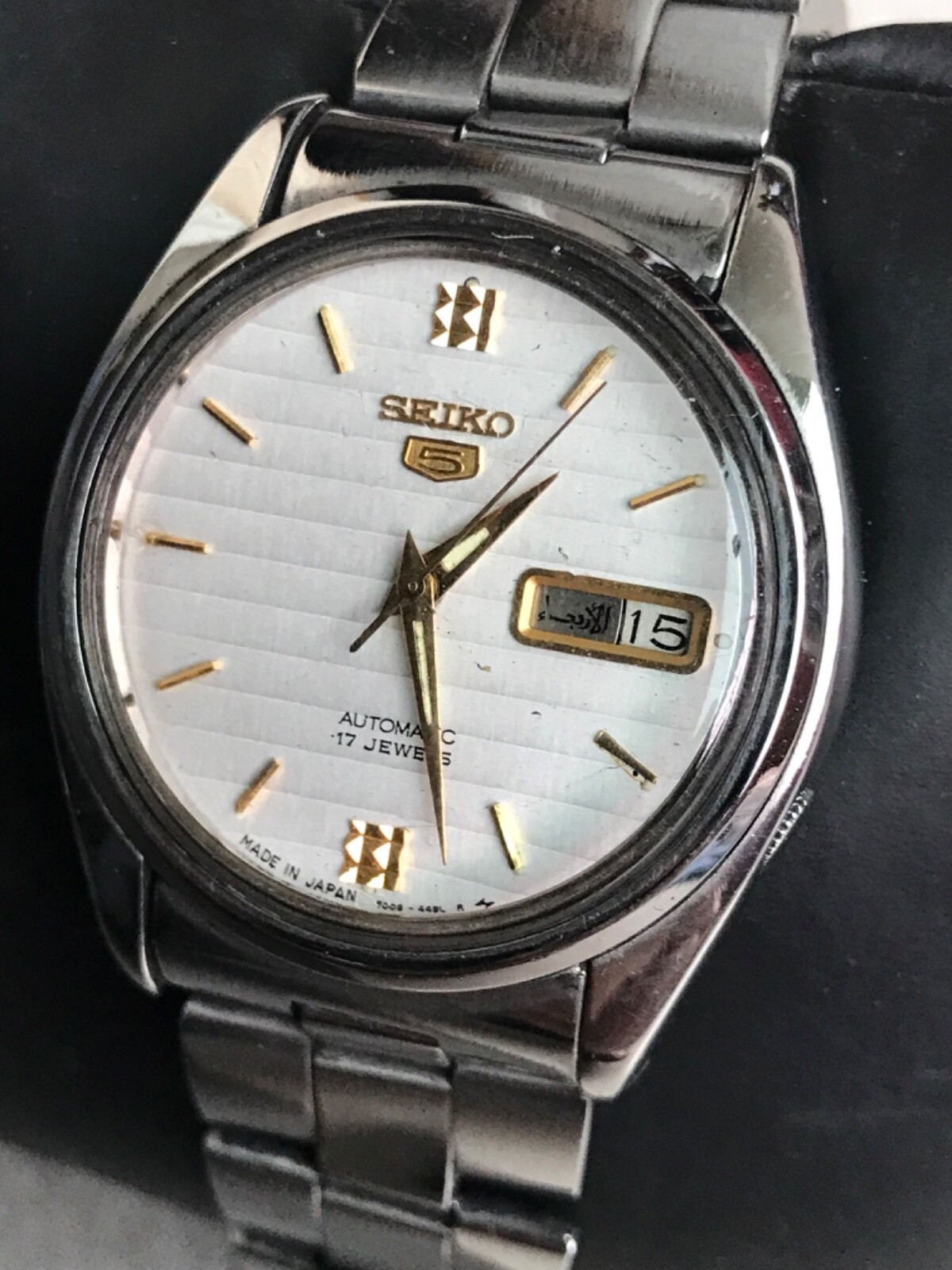 Vintage Seiko 5 7009 automatic watch from the 1970s. This classic dress/formal wristwatch features a silver stainless steel case with a white dial. It has a 36mm case size, 10mm case thickness, and a fixed silver bezel. The watch has a day/date feature, 12-hour dial, and is powered by a mechanical automatic movement. The bracelet has a fold-over push-button deployant closure and fits wrists up to 8 inches. Beautiful and luxurious vintage watch In working condition properly Defects: some scratches are on the watch and glass the dial condition is not very good but fair you can see in pictures Shipping: will be with in 40 to 50 days in case of custom issues and I will need your cooperation in this matter and i also use Fedex and UPS and it costs 40 USD I will recommend you take the fast shipping Any issues please contact me before opening a case because I am only human and endeavour to put things right between us Thank you for looking