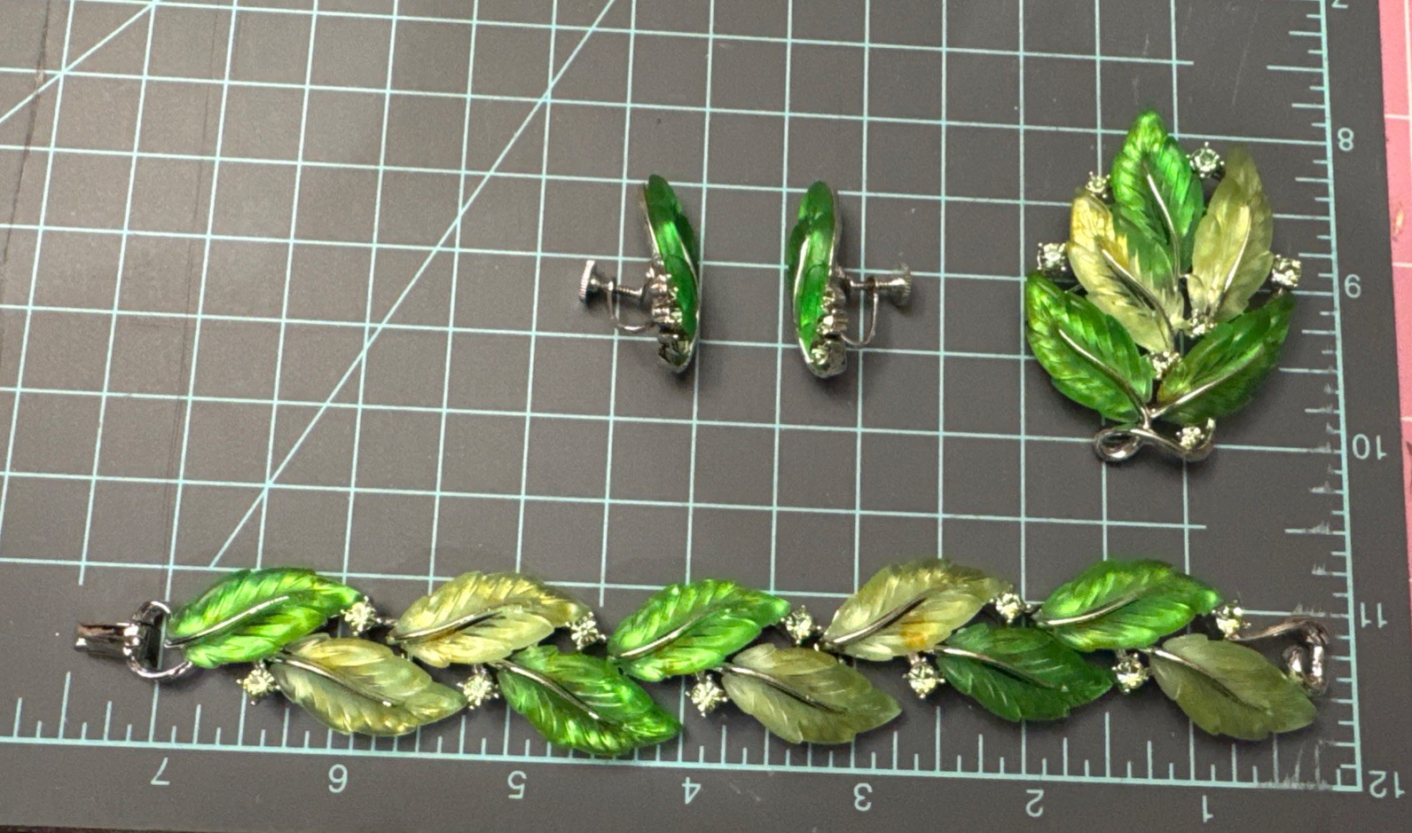 The Vintage Lisner Green Leaf Brooch Bracelet & Earrings Set features a beautiful green rhinestone design, perfect for special occasions such as weddings, anniversaries, and birthdays. The set includes a brooch, bracelet, and earrings, all signed by the brand Lisner. The green crystals and glass stones add a touch of beauty and elegance, making it a timeless piece of jewelry that can be worn on various occasions. The adjustable features ensure a comfortable fit, and the set is a perfect gift for Mother's Day, Father's Day, or Christmas.