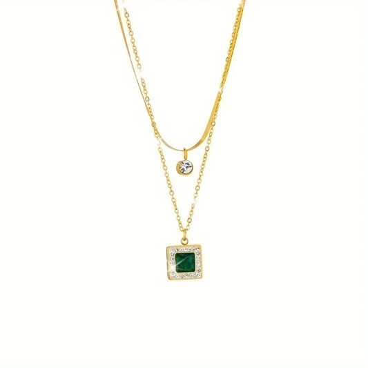 This Vintage Sexy Double-Layer Choker Necklace features a stunning square pendant adorned with green rhinestones, set in titanium steel with a stainless steel chain. The necklace adds a retro touch with its unique design and excellent cut grade, making it a stylish accessory for any outfit. Made in China, this necklace is 47 cm in length and is a perfect choice for those who love vintage-inspired jewelry with a hint of sexiness. Main Material: Stainless Steel Mosaic Material: Rhinestones