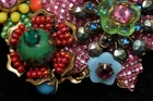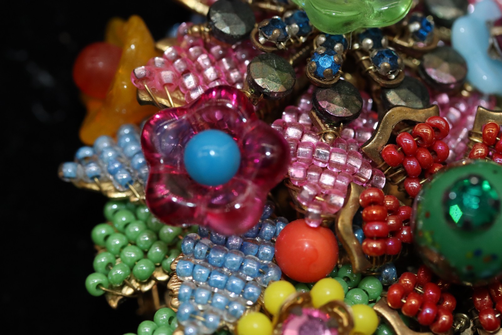 Vintage signed Stanley Hagler flower brooch. 2.5" long by 2" wide. Beautiful beadwork of greens, pinks, reds, and blues. Pressed glass flowers of blue, orange, pink and green. Flowers have rhinestones or beads in the centers. One green glass bead that is painted. Has a rollover clasp on back that works perfectly. Marked Stanley Hagler NYC on back. No missing stones or beads. Mint condition.