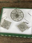 Vtg Silver-Tone Bullet Casing Earrings Pendant 9mm Luger 38 SPL Beautiful Detail The pendant measures about 1.5” not including bail. Says 38 spl Earrings are dangle and the square portion is about 1” tall. They each say 9mm Luger. I’m not sure what the metal is but it seems like stainless steel??